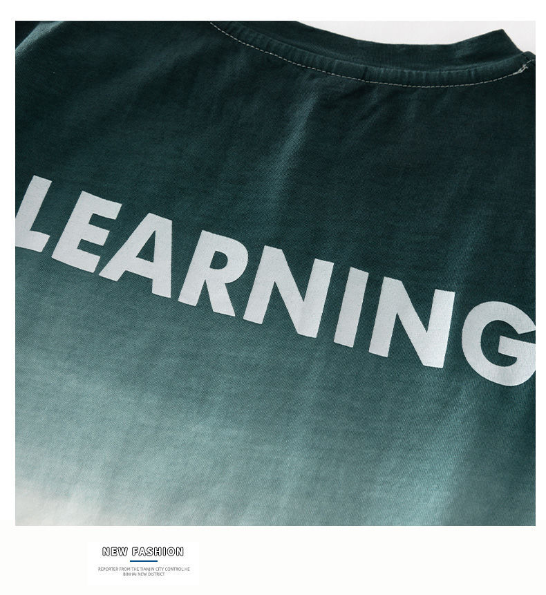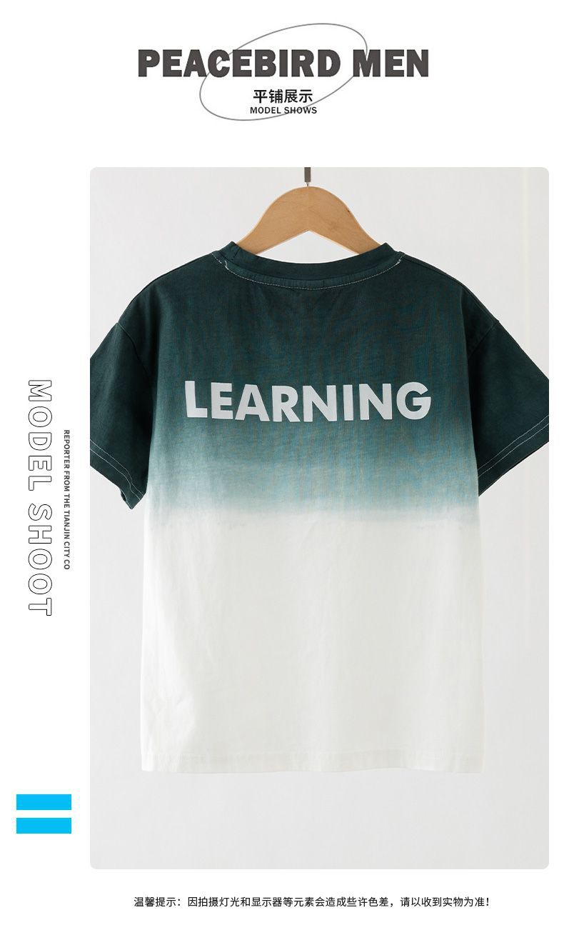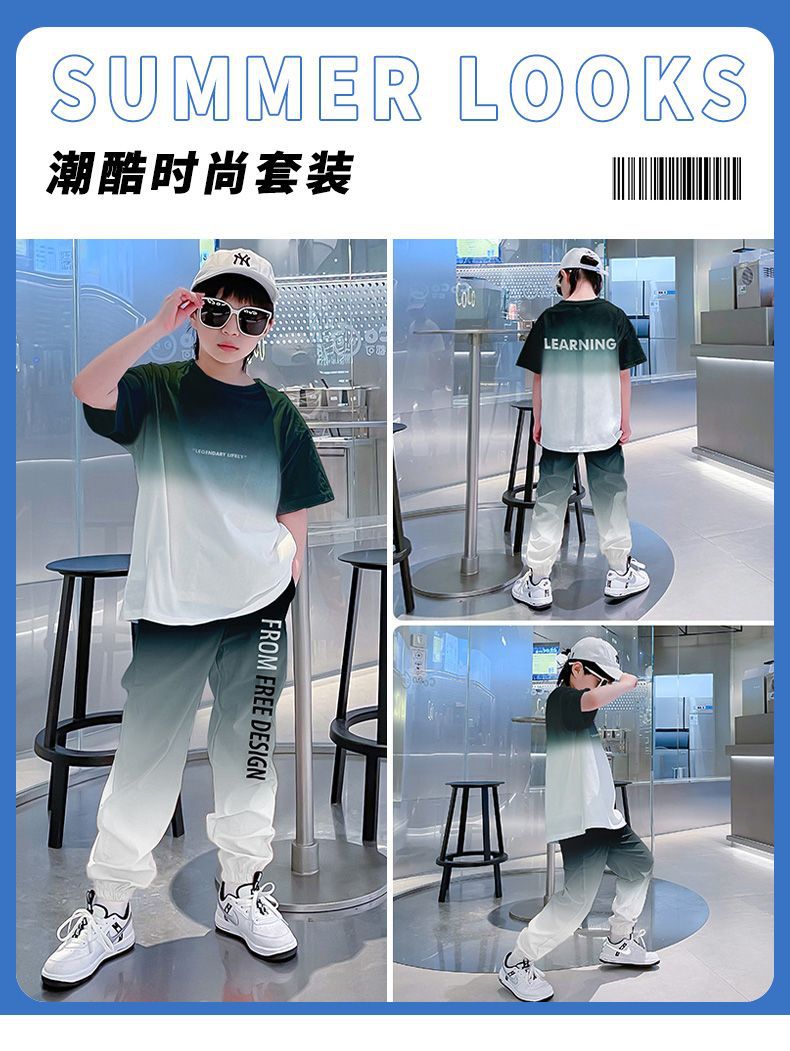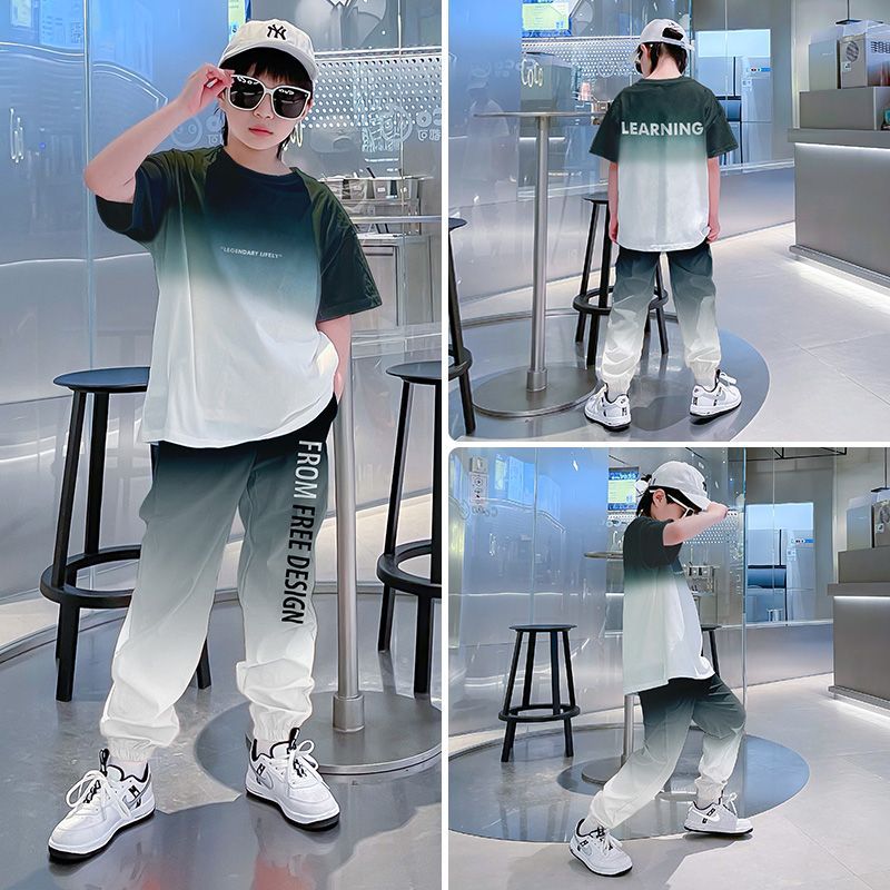 크로스보더 아동 여름 반팔 그라데이션 슈트, 큰 남아용 멋진 옷, 스포츠 레깅스, 트렌디한 투피스 세트스토어 가기
