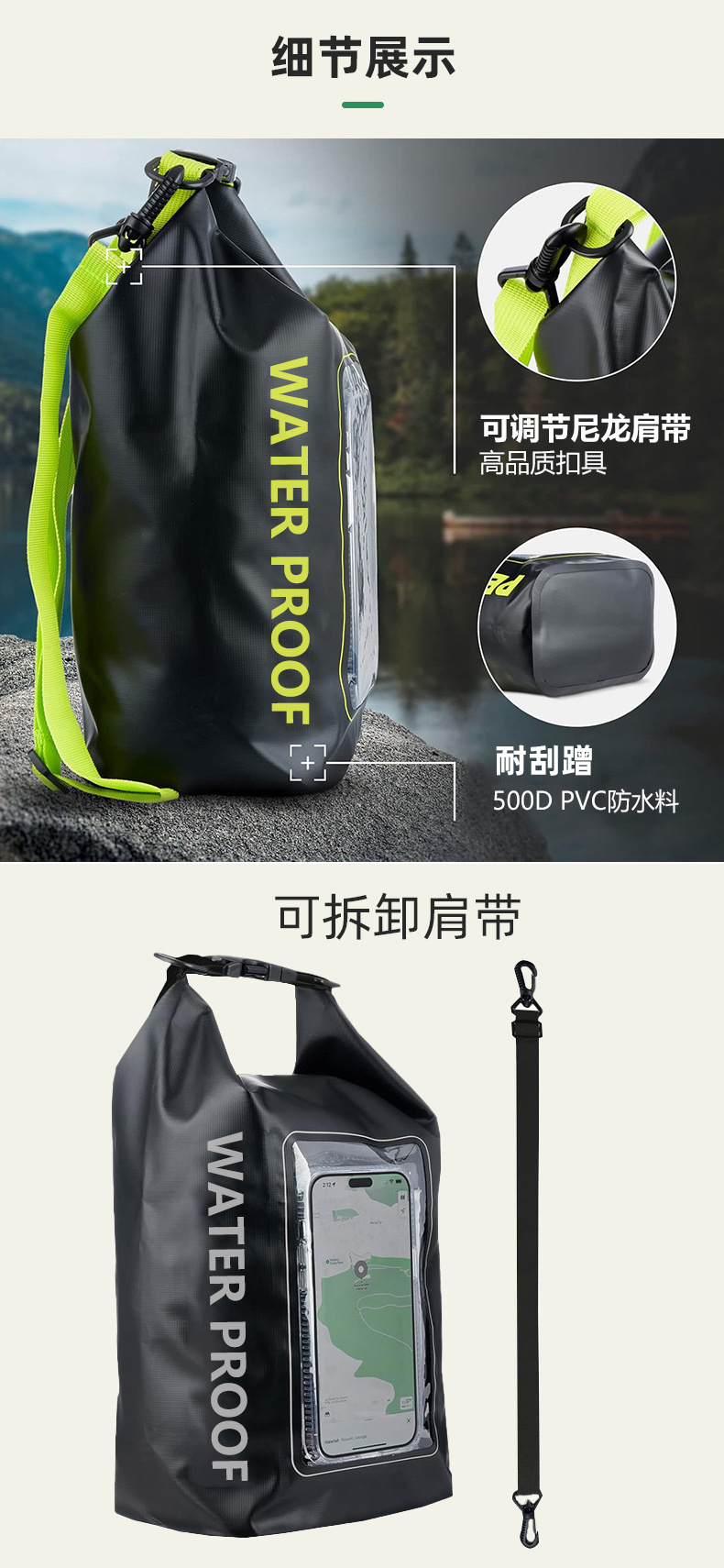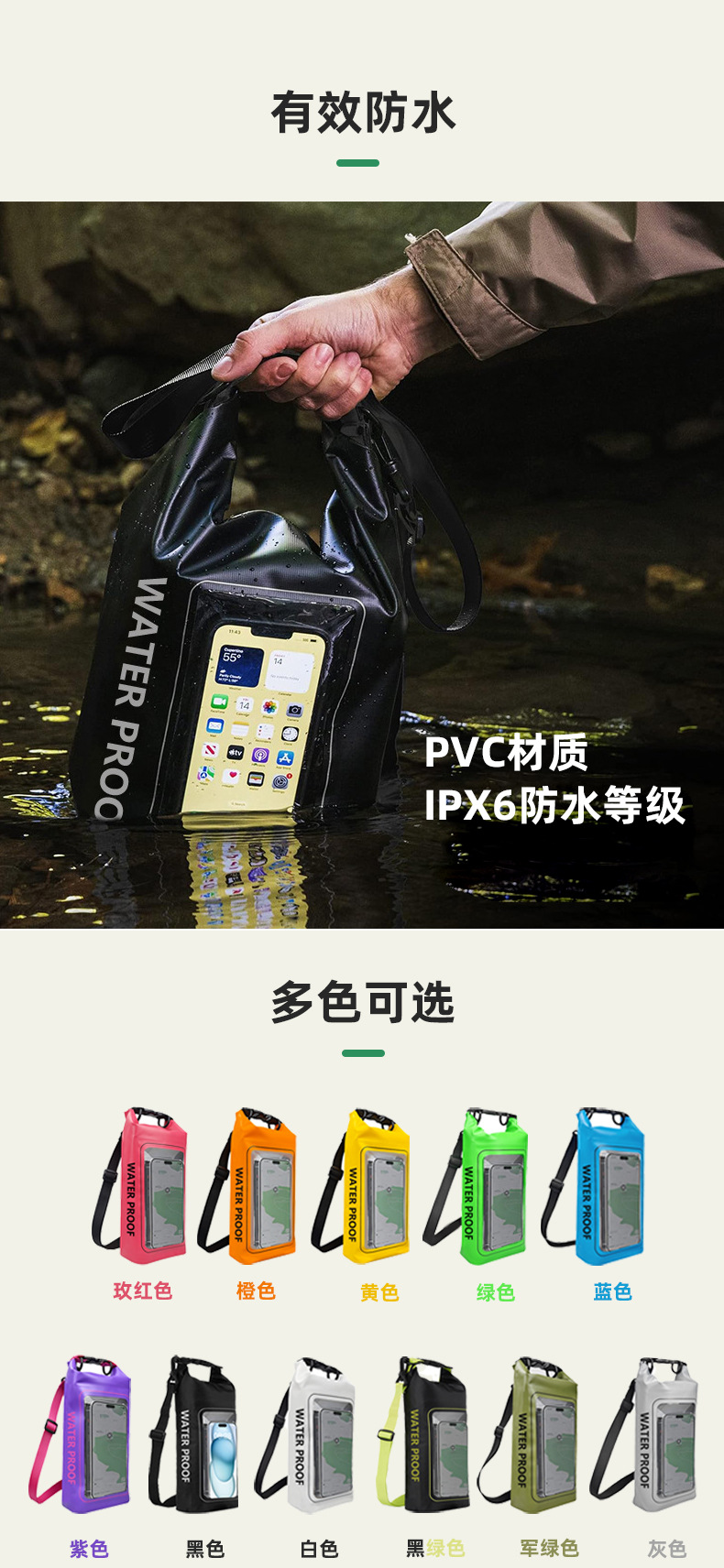 터치 스크린이있는 야외 2-in-1 PVC 휴대 전화 방수 가방 래프팅 휴대 전화 방수 가방 수영 방수 가방 어깨 가방
