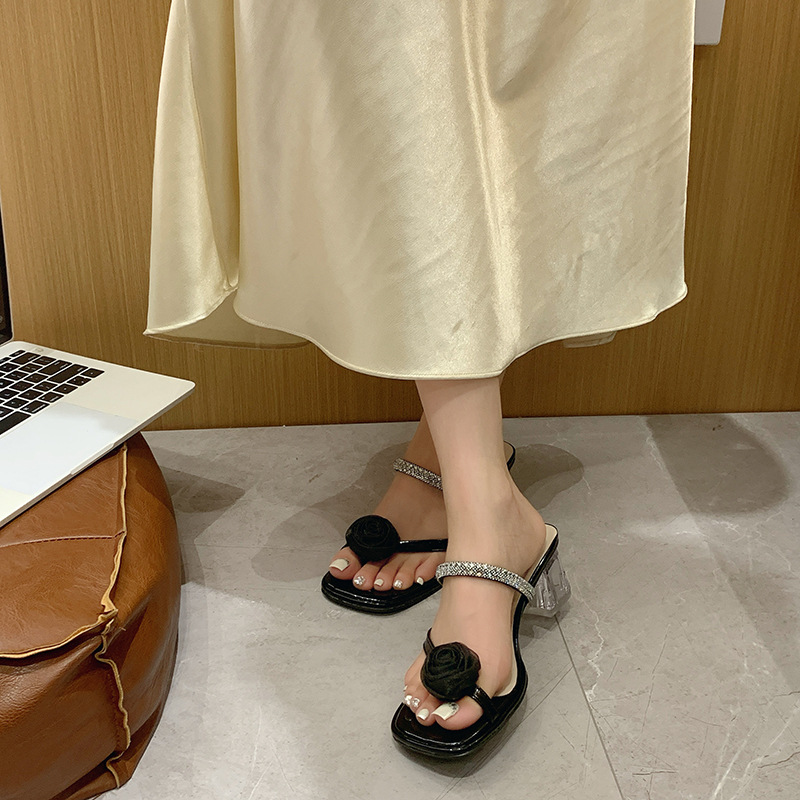2025년 여름 신상 여성용 프렌치 두꺼운 굽 슬리퍼, 꽃 모조 다이아몬드 슬립온, 프렌치 데일리 하이힐 샌들스토어 가기