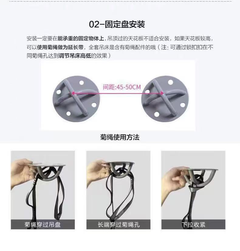 注意:安装吊床需要顶上可以打孔,或者安装了承重举架!