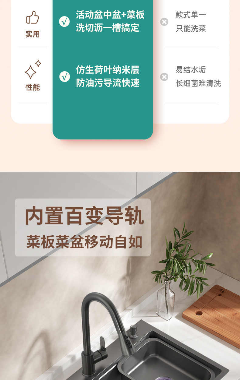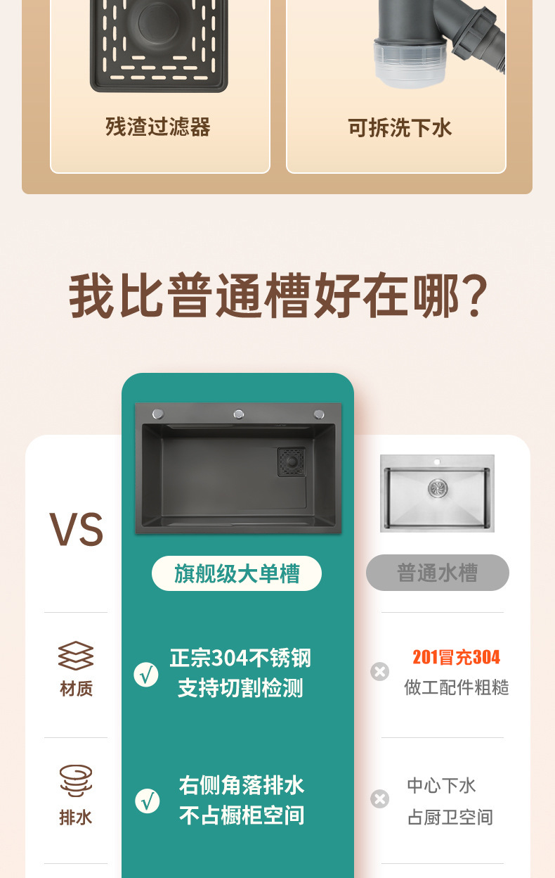 ✅ 주방 304 스테인레스 스틸 싱크대 검정색 나노 싱크대 대형 단일 슬롯 싱크대 두꺼운 식기 세척 싱크대