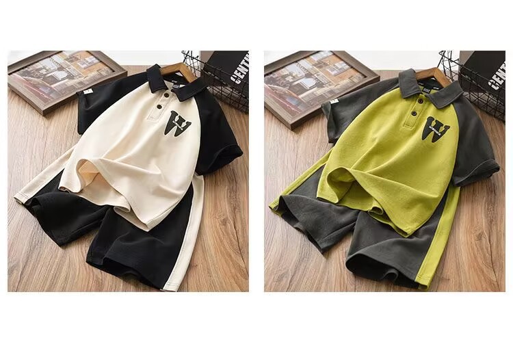 큰 어린이를 위한 소년의 새로운 여름 컬러 블록 폴로 반팔 양복, 캐주얼 라펠, 서양식 스포츠 얇은 투피스 세트