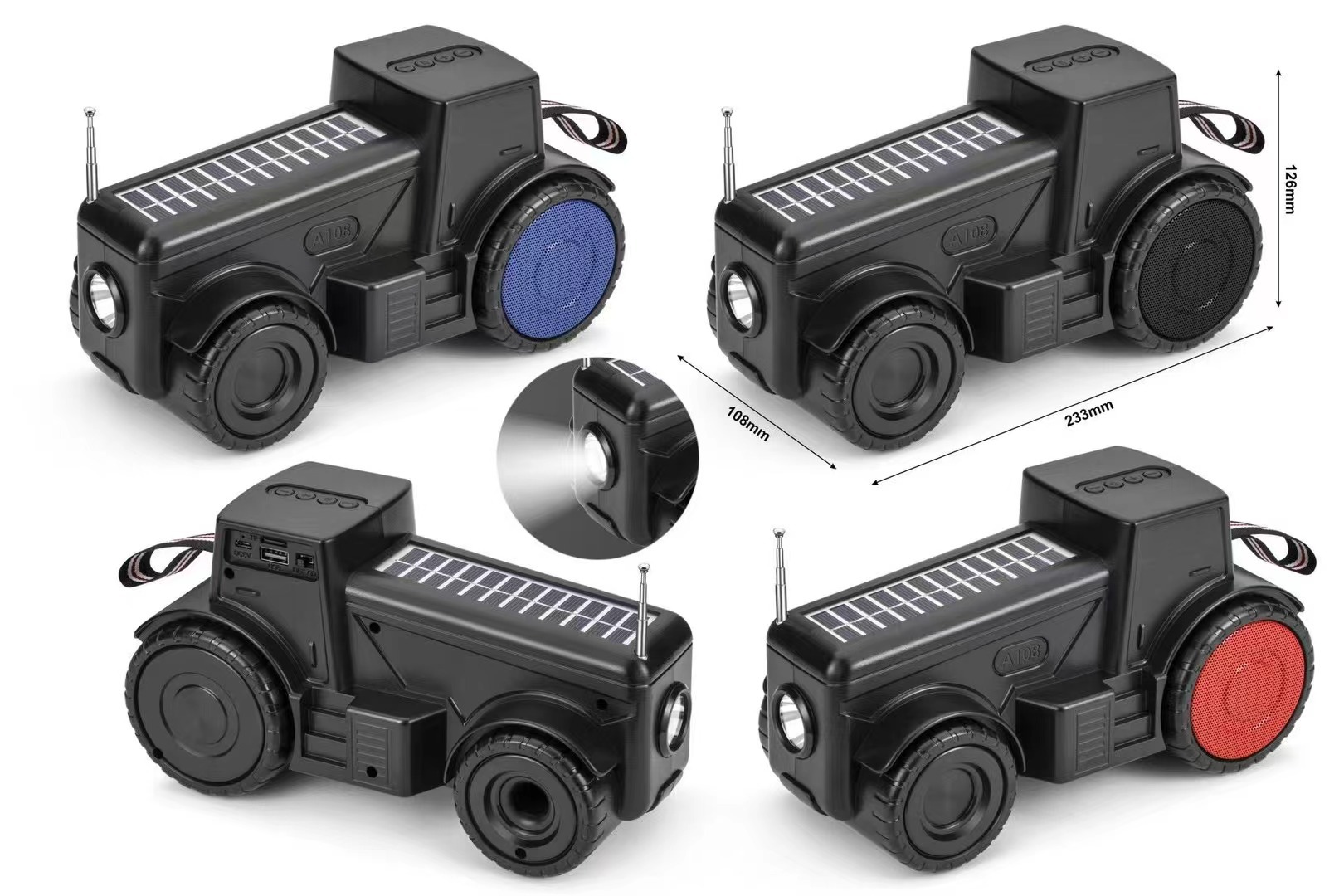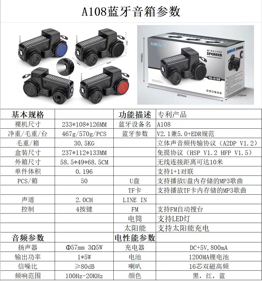 새로운 YG-A108 아프리카 뜨거운 판매 자동차 모델 무선 블루투스 스피커 태양 전지 패널 충전 손전등 스피커