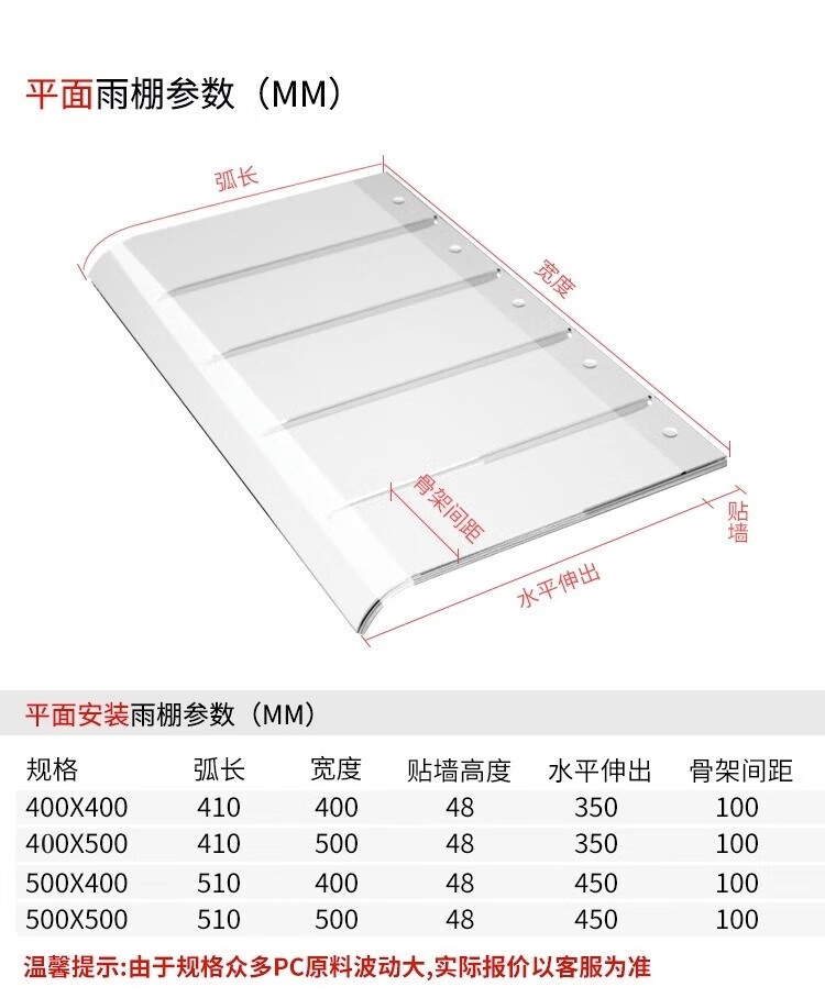 • [상하 가장자리가 평평한 설치 모델] 투명 컬러 확장 50*40cm 강화 리브 어닝
