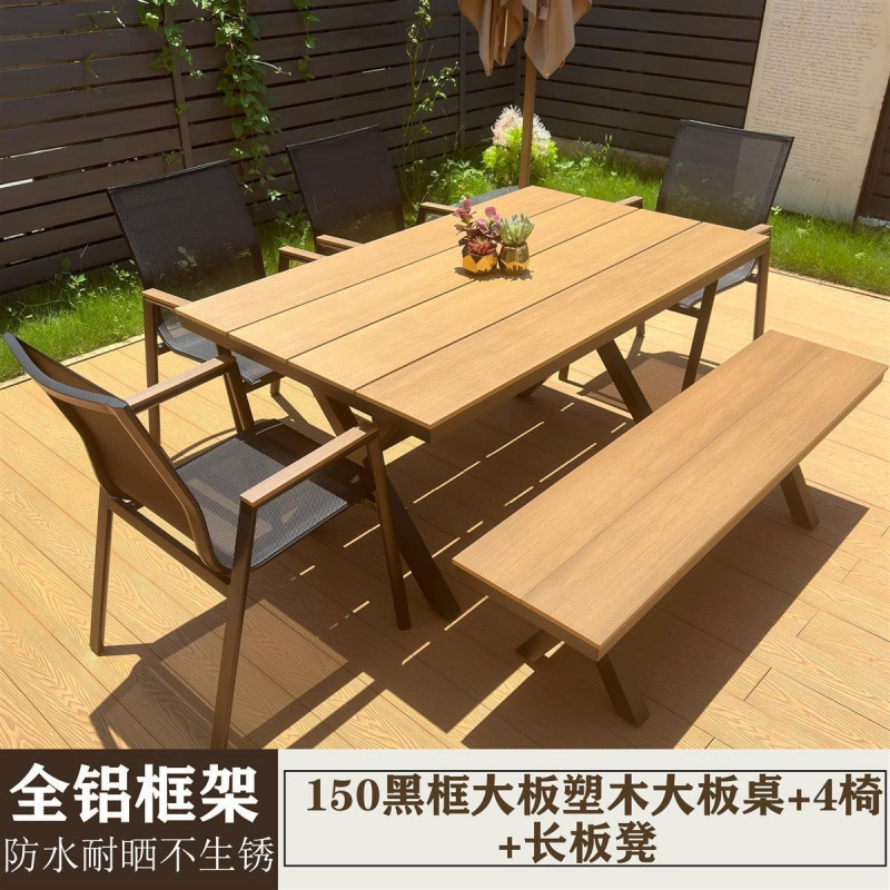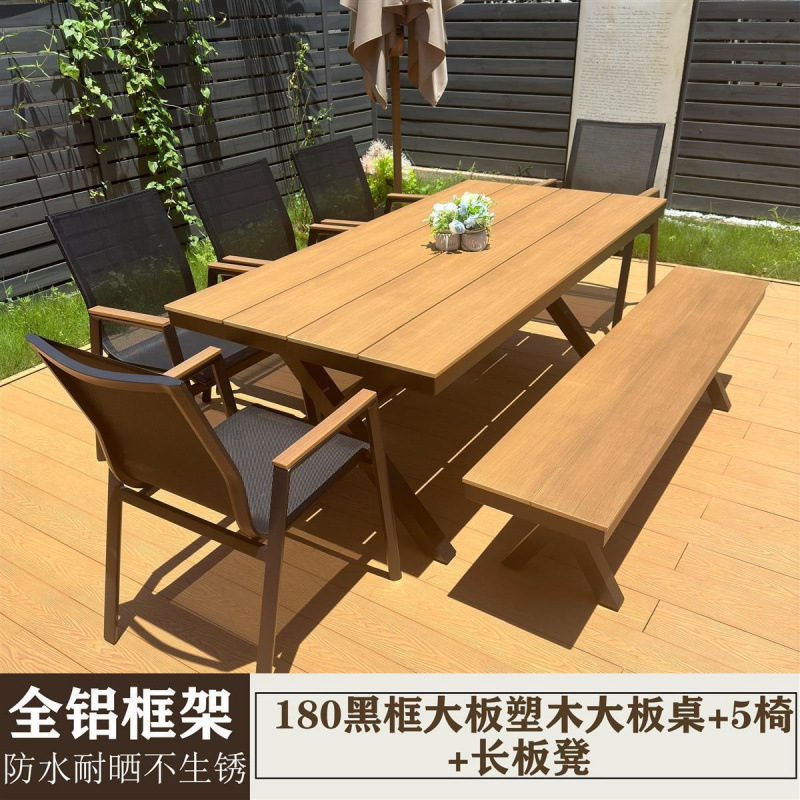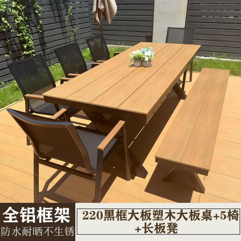 • 220 블랙 프레임 대형 플라스틱 나무 긴 테이블 + 의자 5개 + 긴 벤치