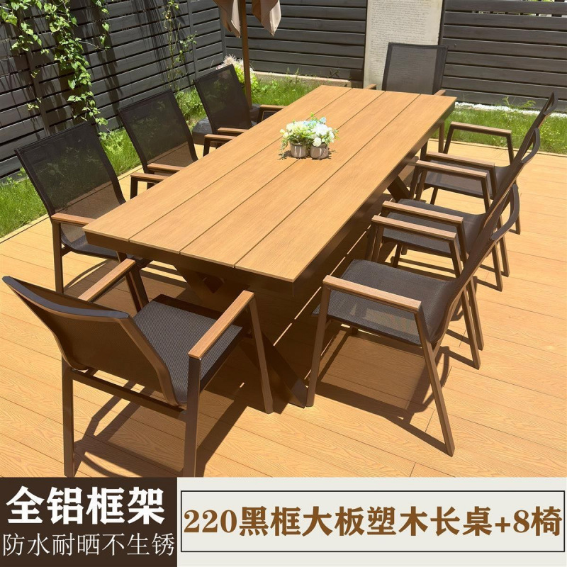 • 220 블랙 프레임 대형 플라스틱 나무 긴 테이블 + 의자 8개