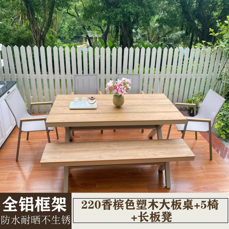 • 220 샴페인 프레임 대형 플라스틱 나무 긴 테이블 + 의자 5개 + 긴 벤치