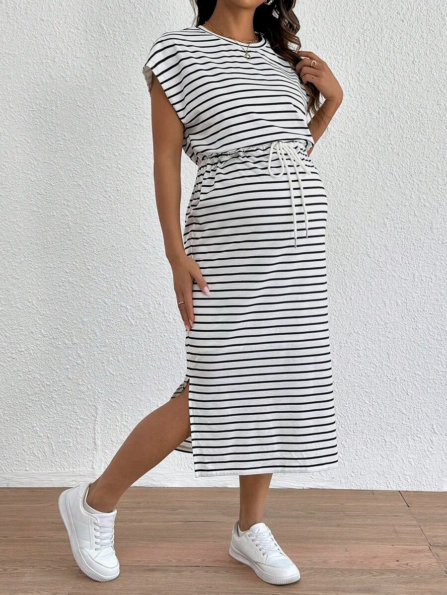 국경 간 유럽과 미국 의류 배트 슬리브 라운드 넥 풀오버 루즈 탑 드로스트링 스트라이프 슬릿 슈트 스커트 임부복스토어 가기