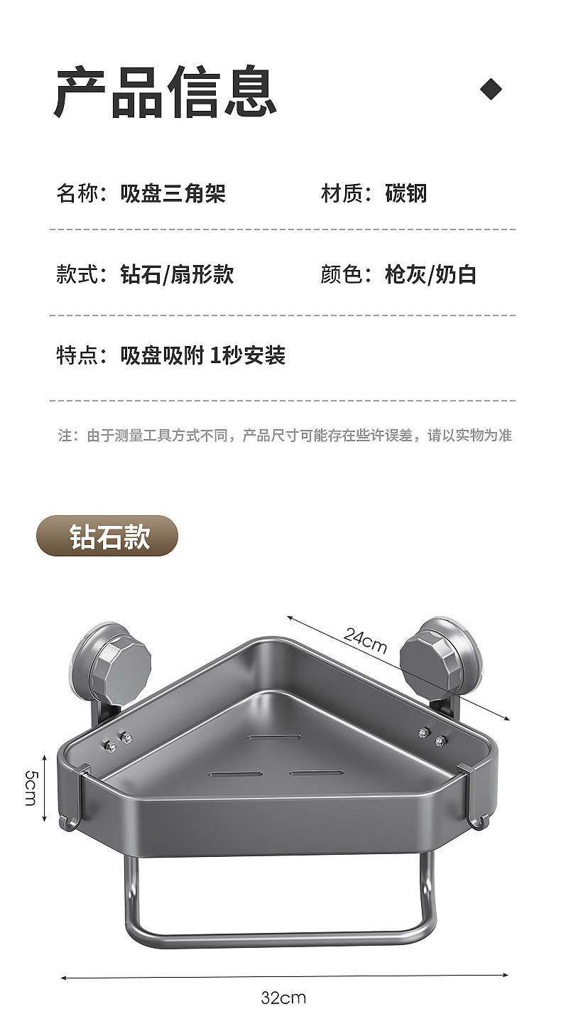 소스 공장 욕실 흡입 컵 삼각형 선반 욕실 막대가있는 펀치없는 벽걸이 형 욕실 코너 선반