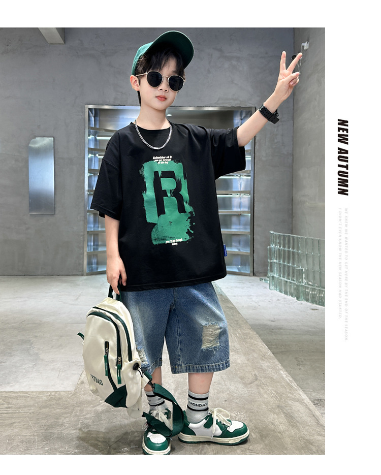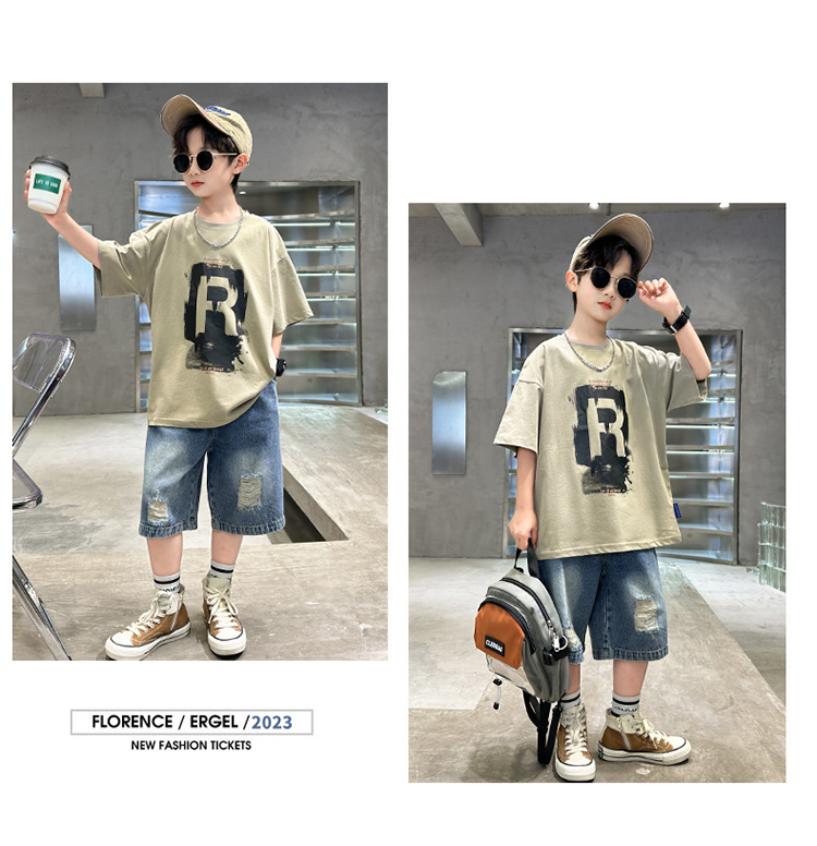아동 여름 아동복 소년 시원하고 잘 생긴 여름 순면 반팔 티셔츠 정장 2025 큰 어린이를위한 새로운 유행 브랜드스토어 가기