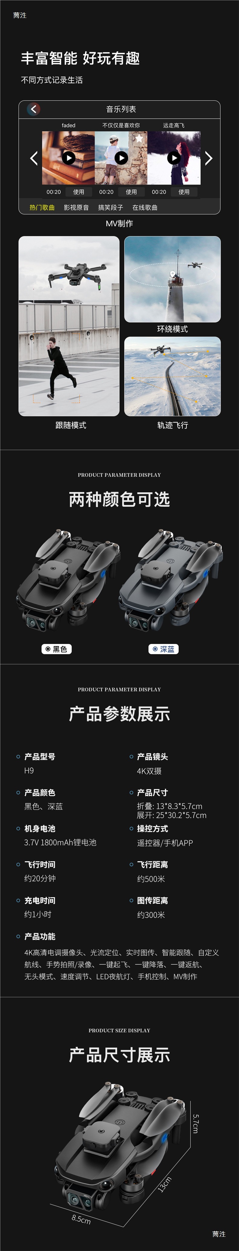 • 고급형 모델 H9 블랙 - 듀얼 배터리 480P - 배터리 수명 40분