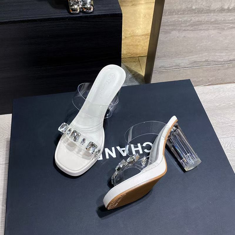 프렌치 투명 하이힐, 라인스톤 크리스탈 슬리퍼, 하이엔드 아우터웨어, 두꺼운 굽, 하이힐, 2025 새로운 스타일스토어 가기