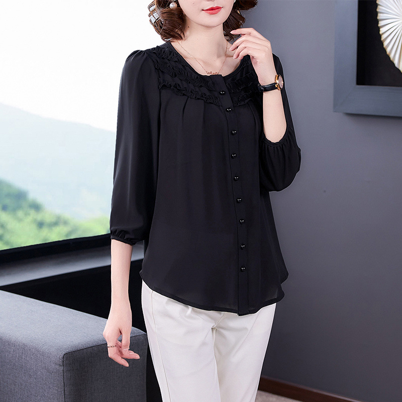 여성용 루즈한 플러스 사이즈 쉬폰 셔츠 2025 봄, 가을 새로운 스타일 9부 소매 배를 덮는 세련된 긴팔 카디건 엄마 탑