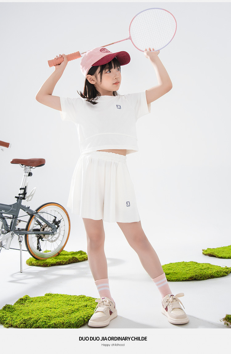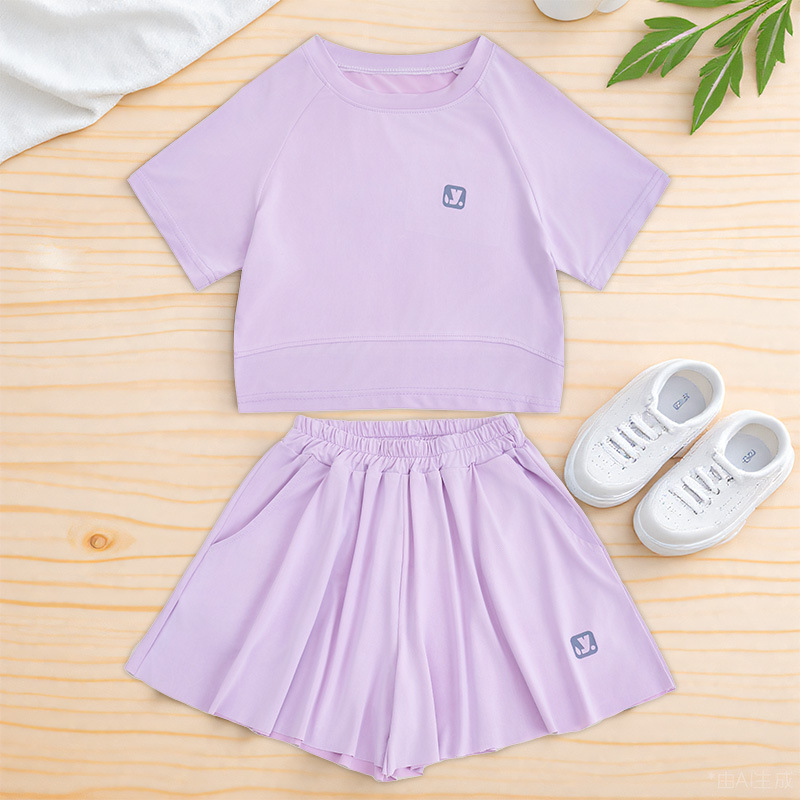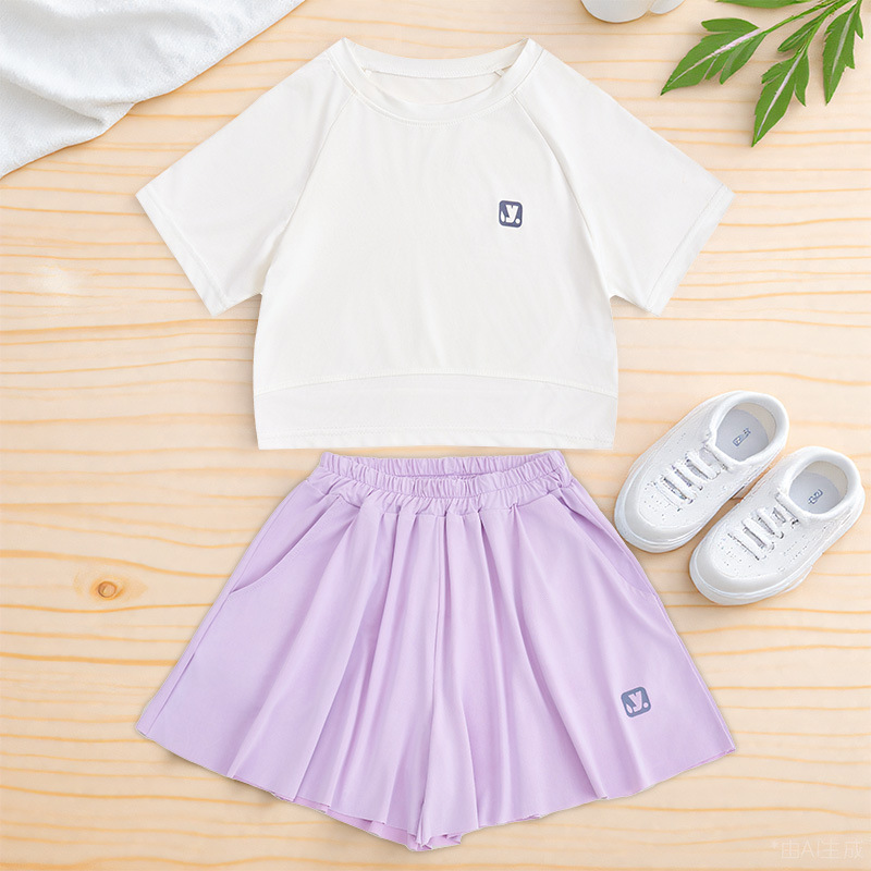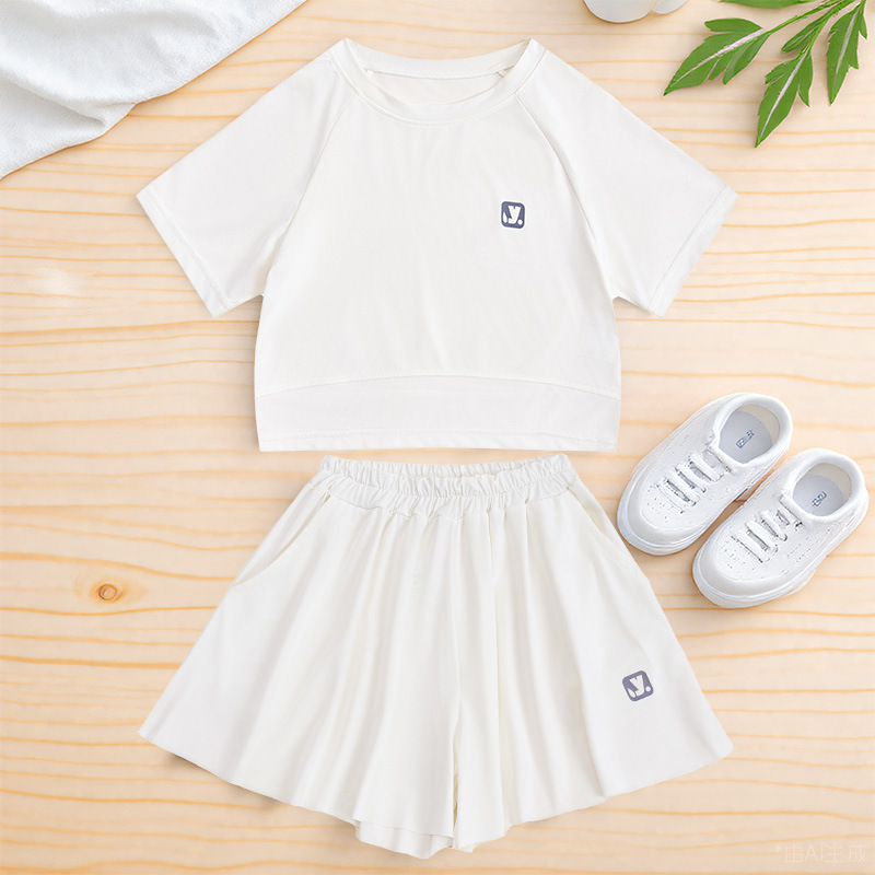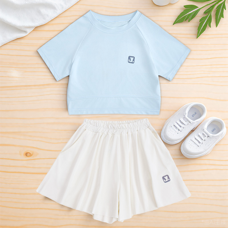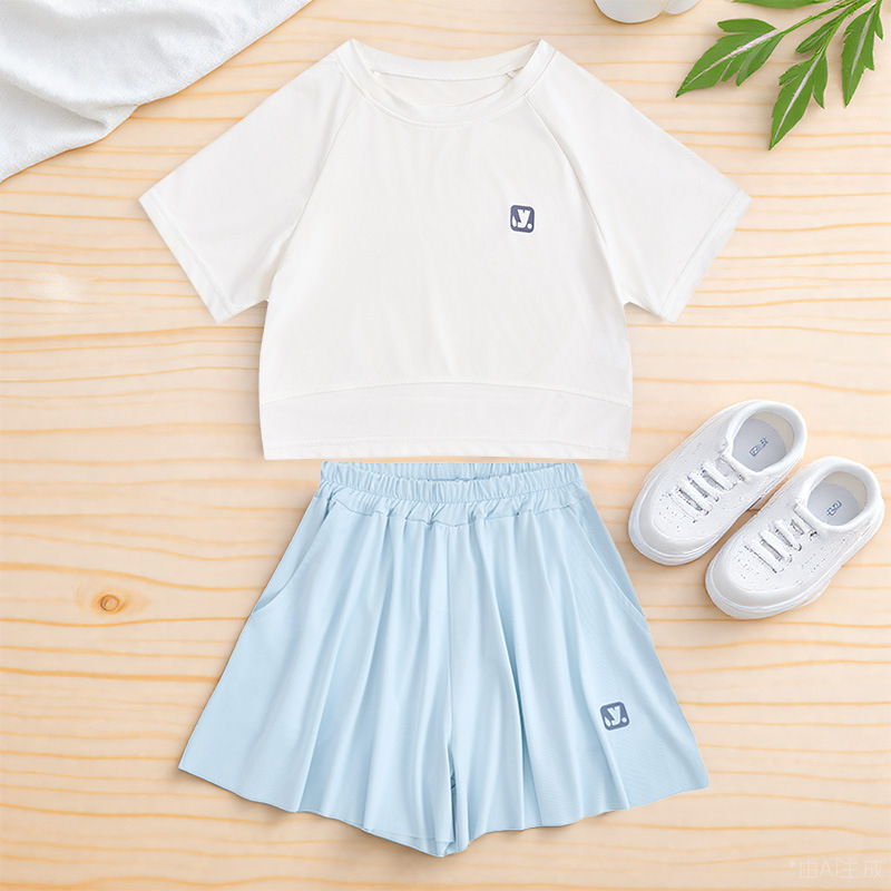 여름 소녀 얼음 실크 슬리브 짧은 티셔츠와 바지 스커트 투피스 세트 어린이의 새로운 멋진 가정 의류 세트 단색 신선한스토어 가기