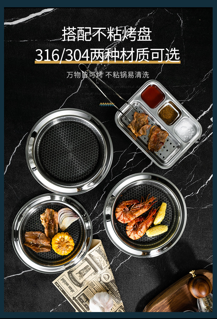 主要材质:烤盘316+烤炉410+炭格410+烤网210