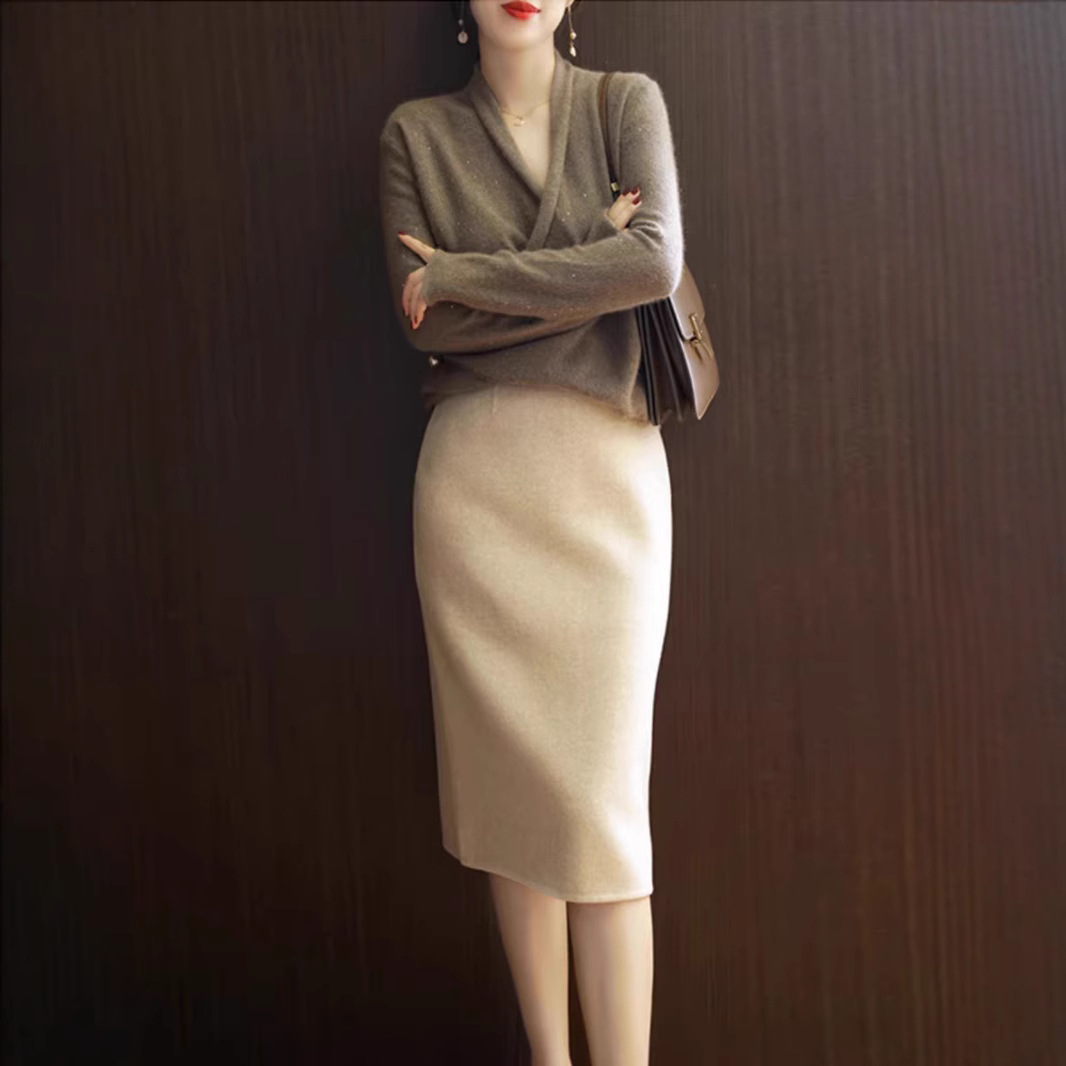 초가을 신상 여성복, 고급 홍콩 스타일, 복고풍 시크 기질, 여신 스타일, 가볍고 성숙한 니트 투피스 슈트 스커트