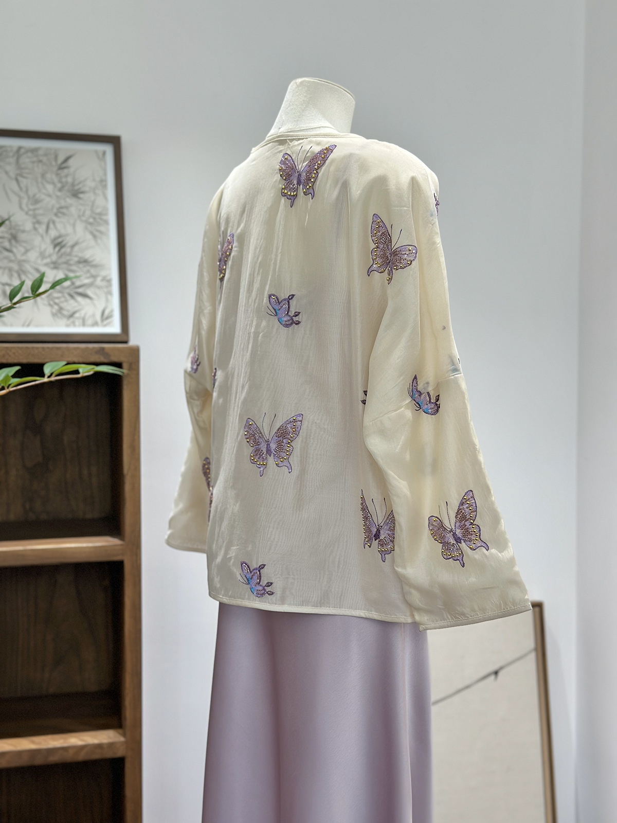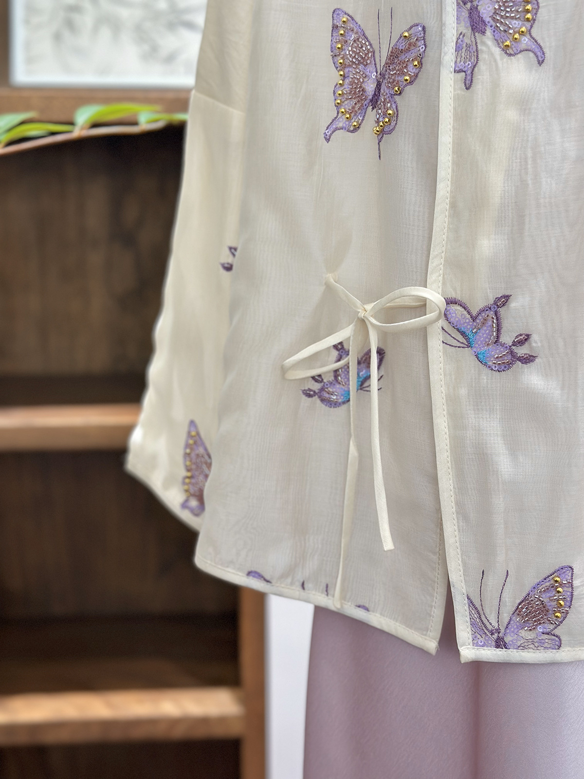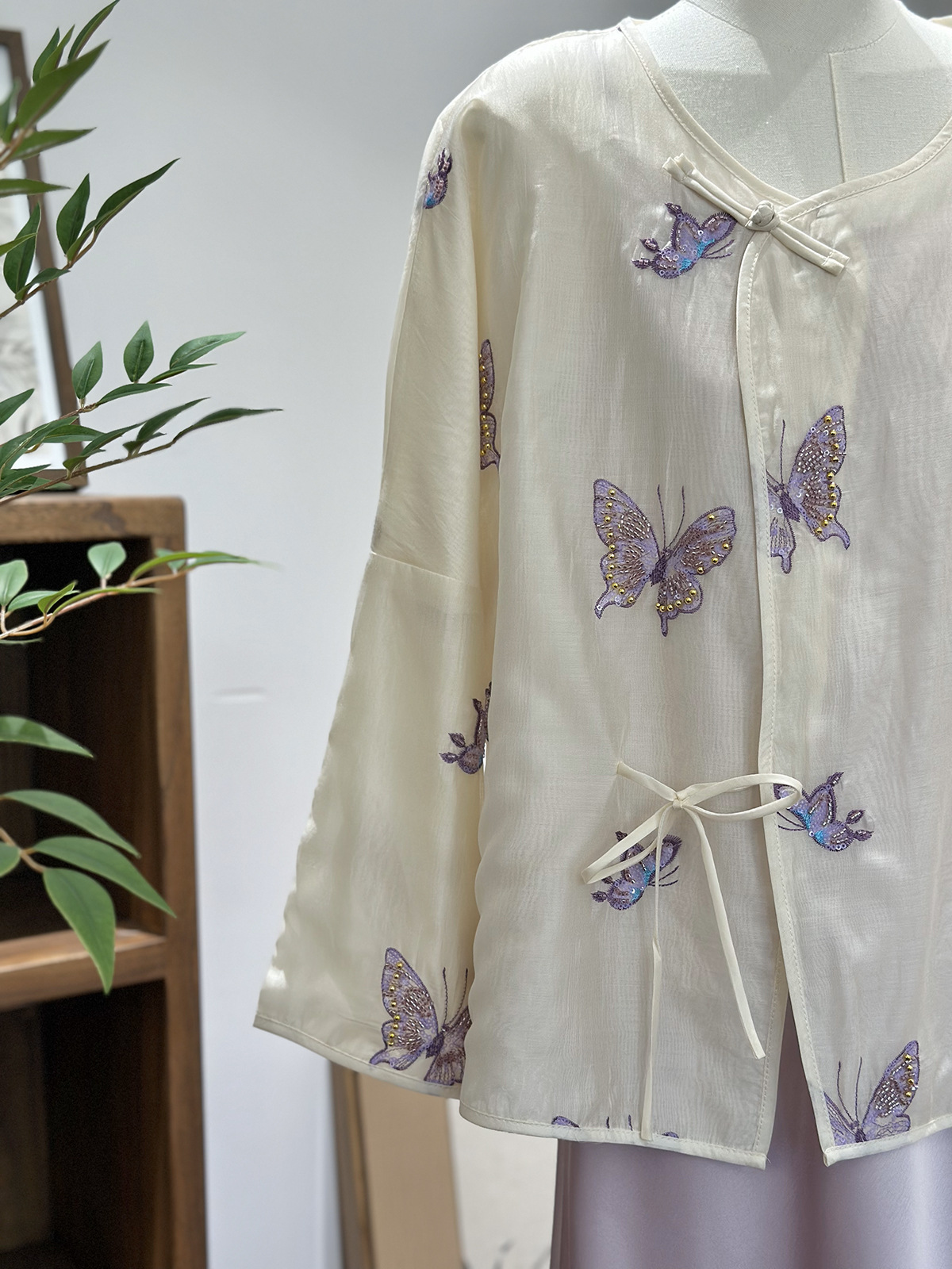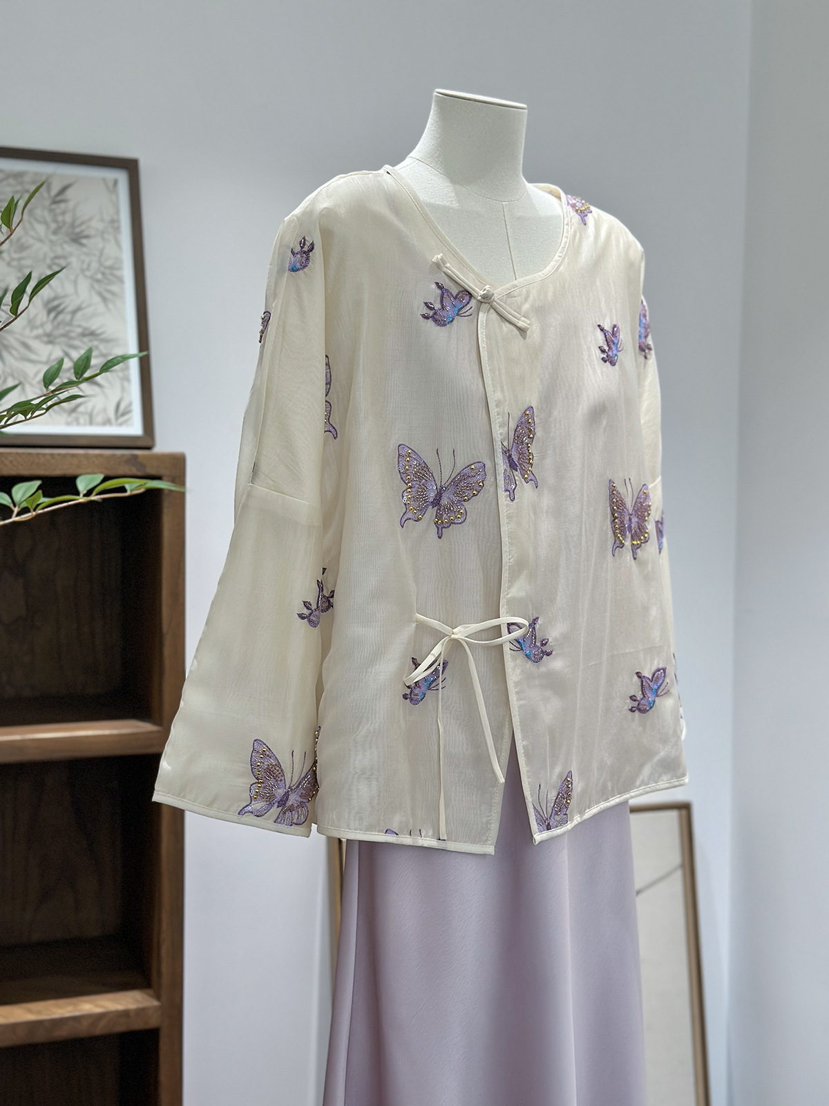 새로운 중국 스타일 봄과 여름 고급 보라색 나비 구슬 자수 대각선 레이스 업 선샤인 셔츠 셔츠 탑 재킷 새로운