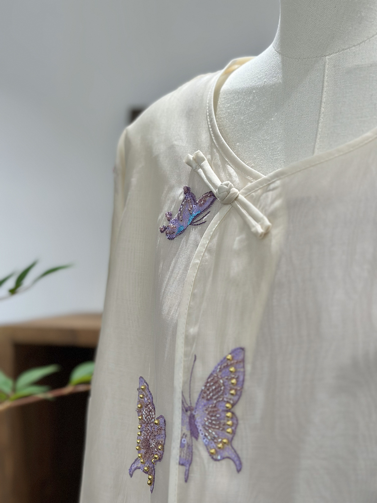 새로운 중국 스타일 봄과 여름 고급 보라색 나비 구슬 자수 대각선 레이스 업 선샤인 셔츠 셔츠 탑 재킷 새로운스토어 가기