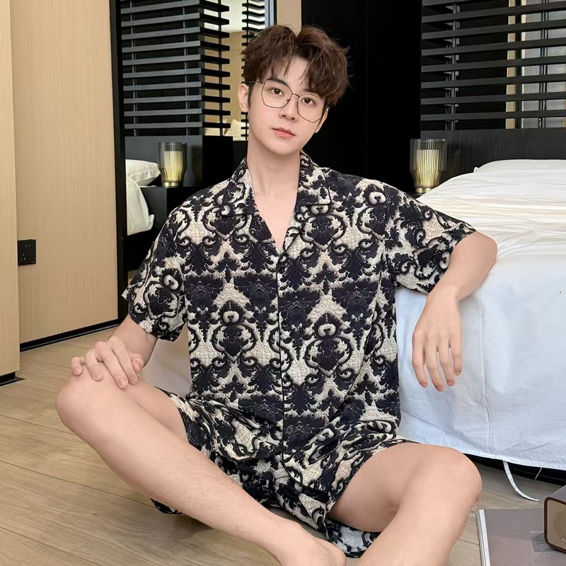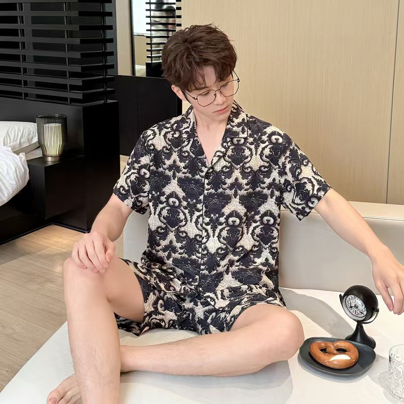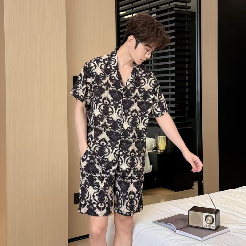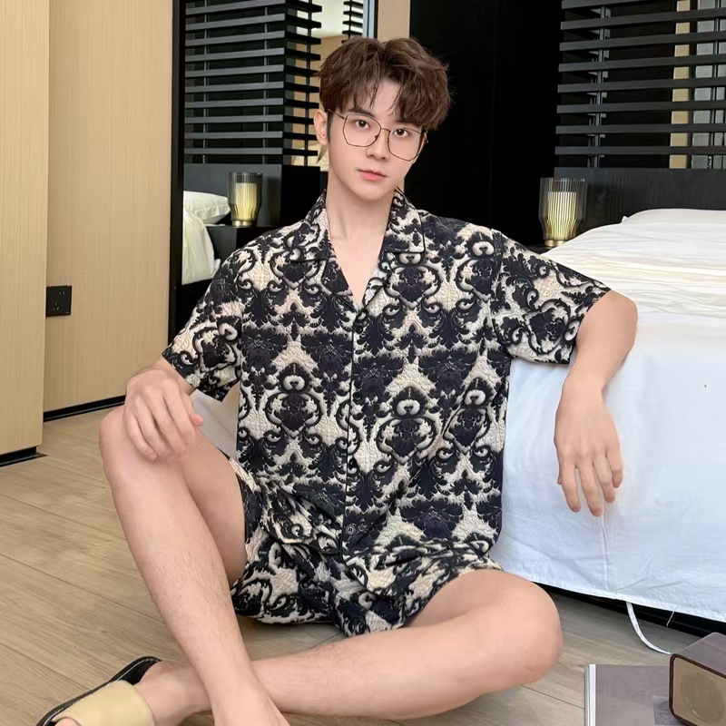 여름 남성의 새로운 얼음 실크 느슨한 통기성 반팔 반바지 투피스 양복 3D 입체 양각 인쇄 홈웨어스토어 가기