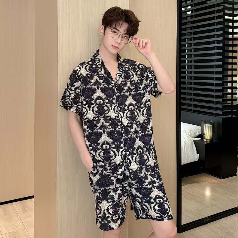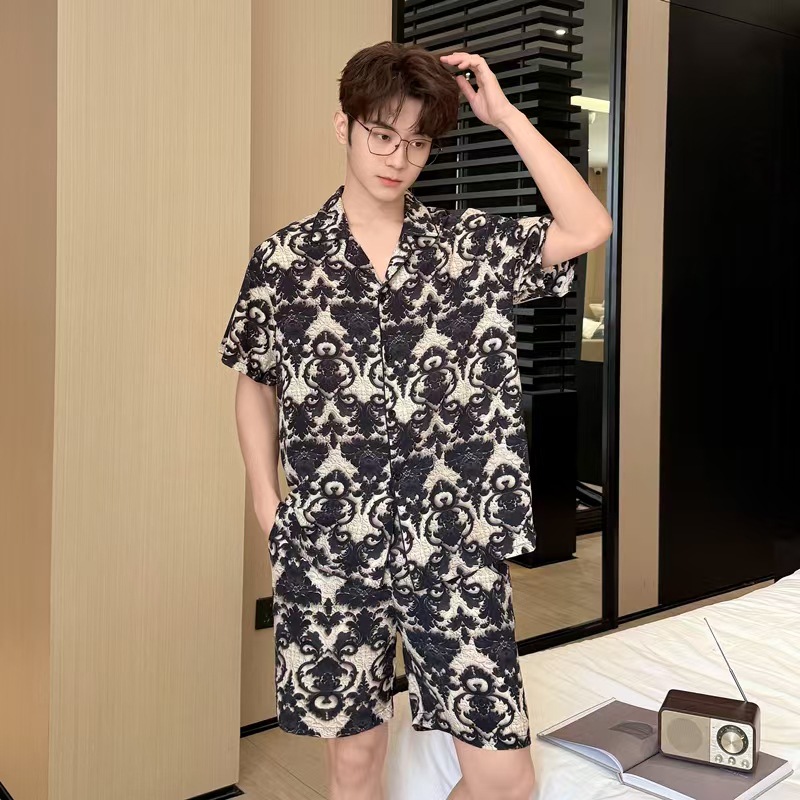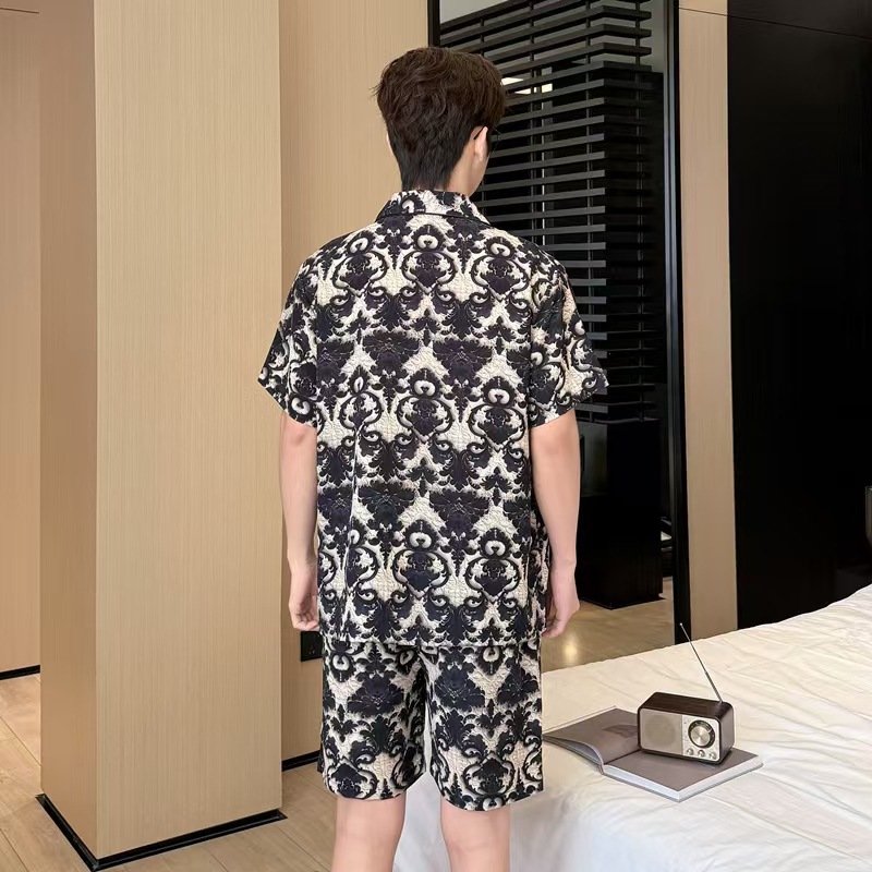 여름 남성의 새로운 얼음 실크 느슨한 통기성 반팔 반바지 투피스 양복 3D 입체 양각 인쇄 홈웨어