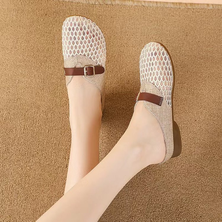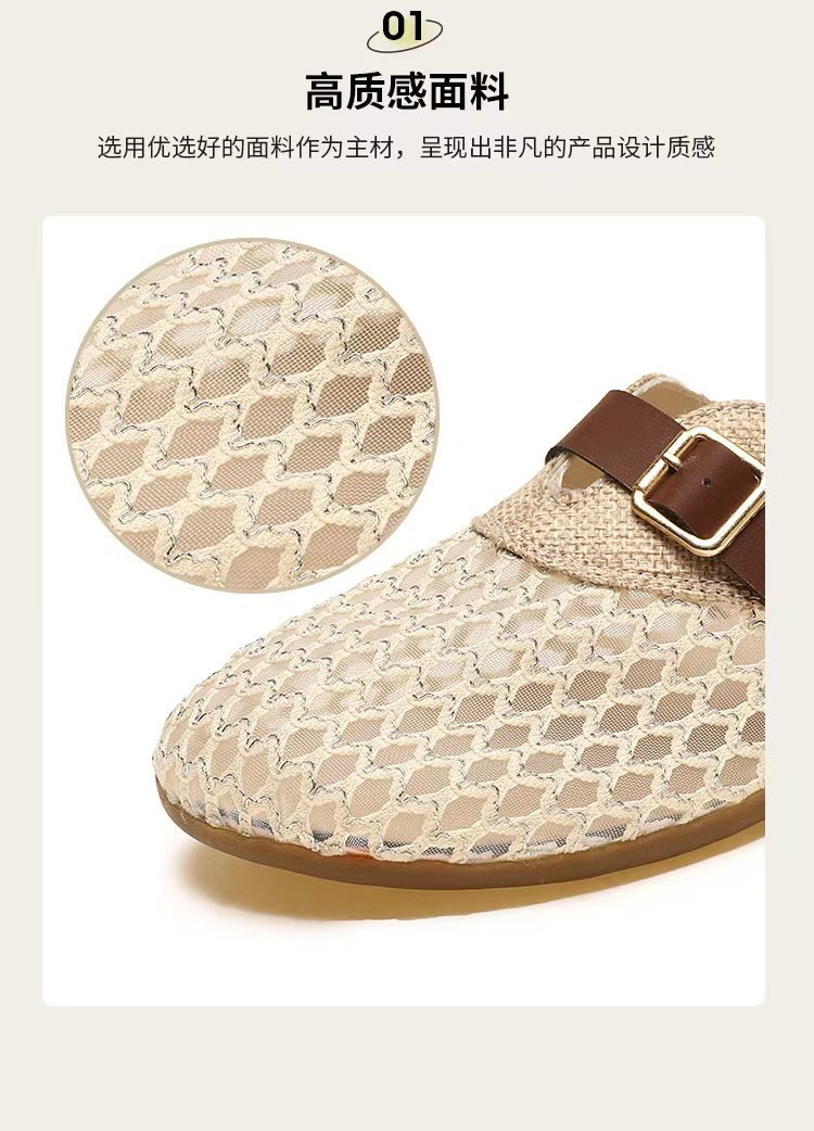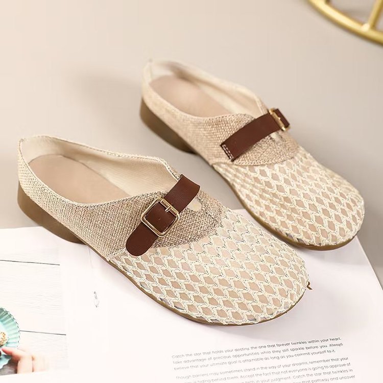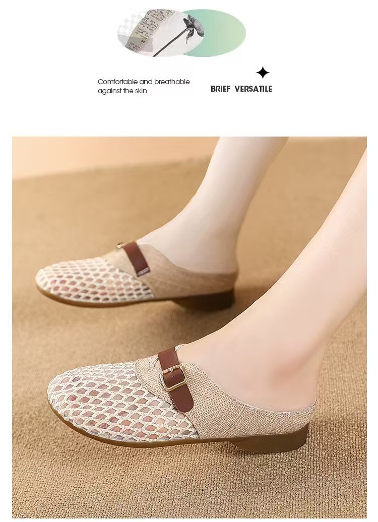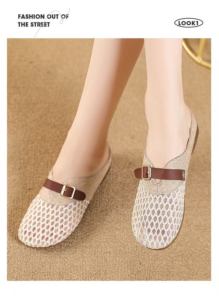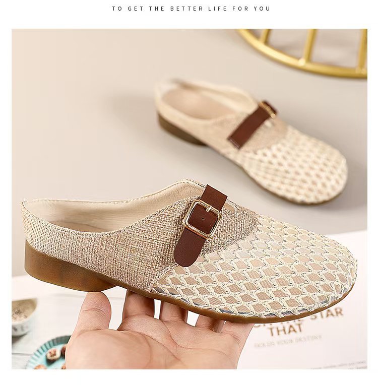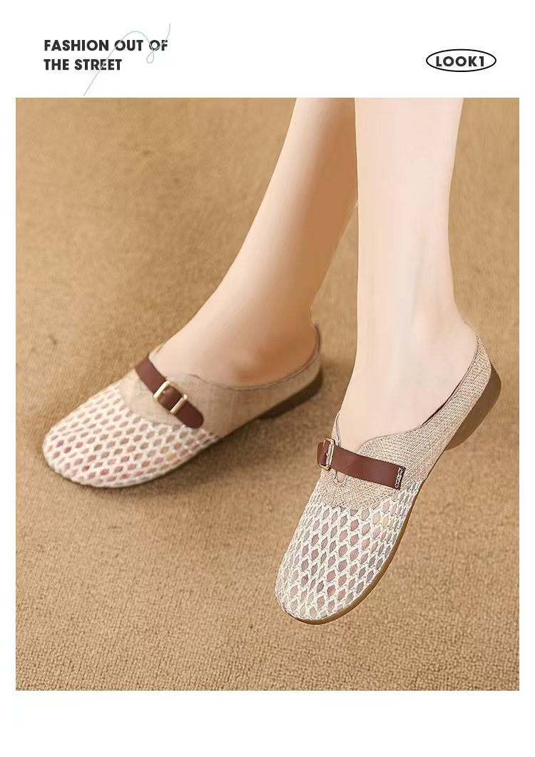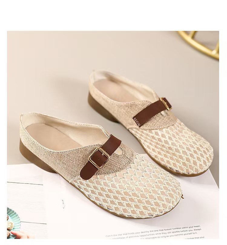여성을위한 메쉬 하프 슬리퍼 2025 새로운 여름 플랫 바닥 중공 패션 중공 여름 스타일 Baotou 외부 샌들스토어 가기