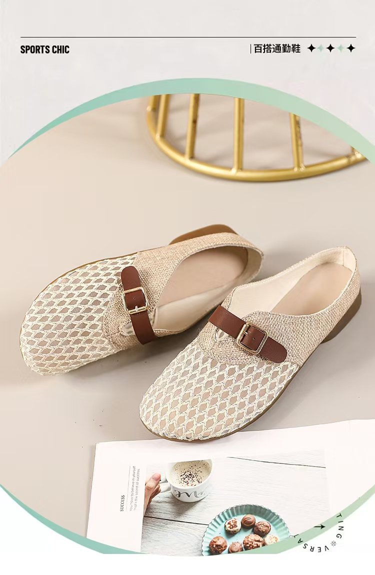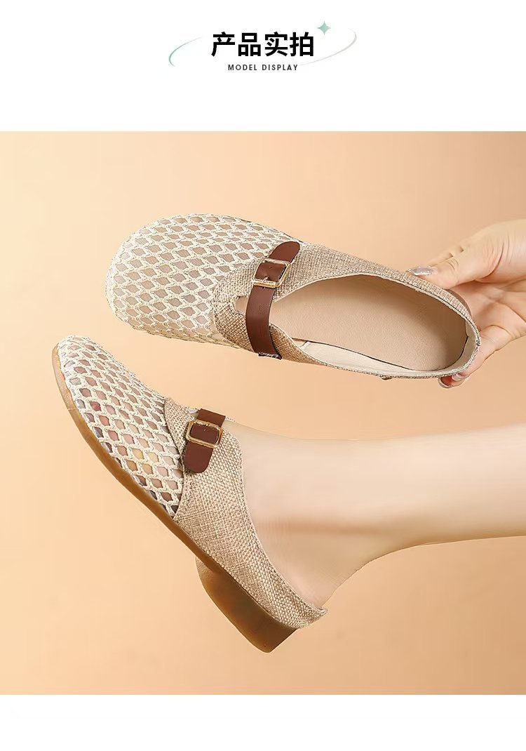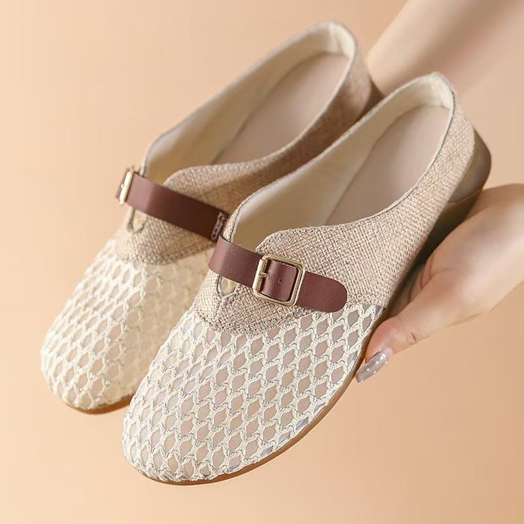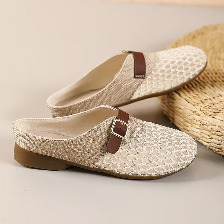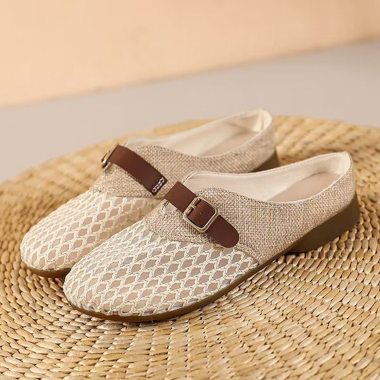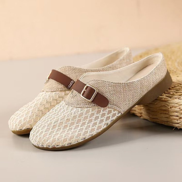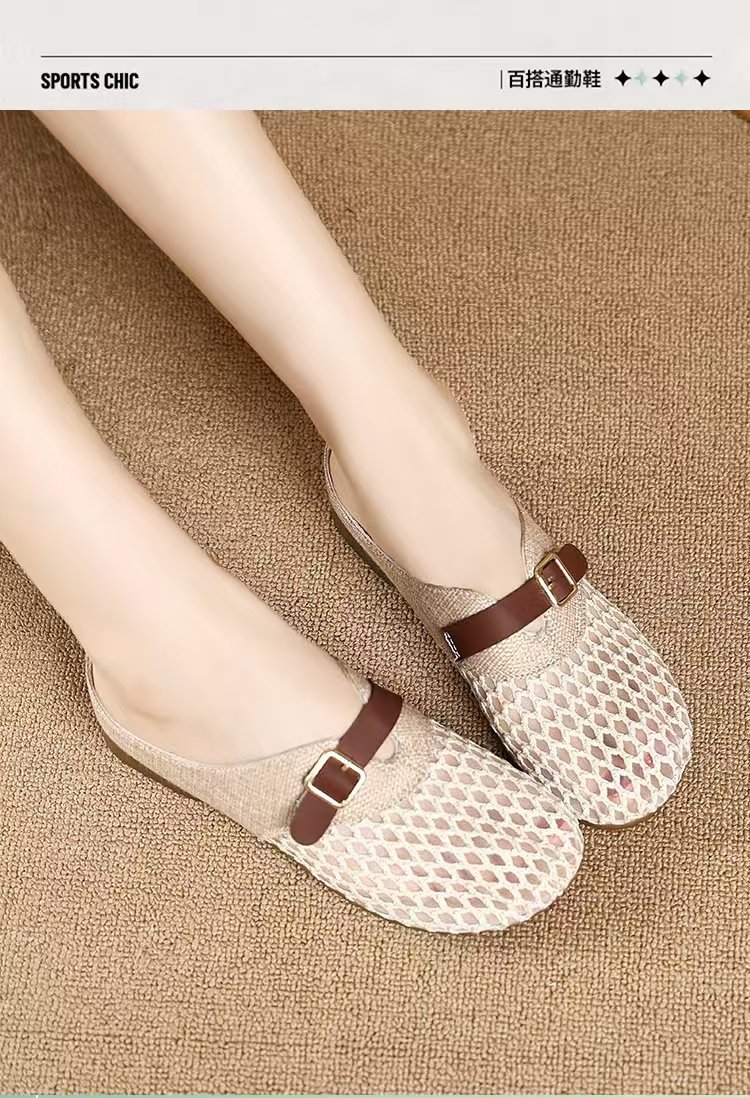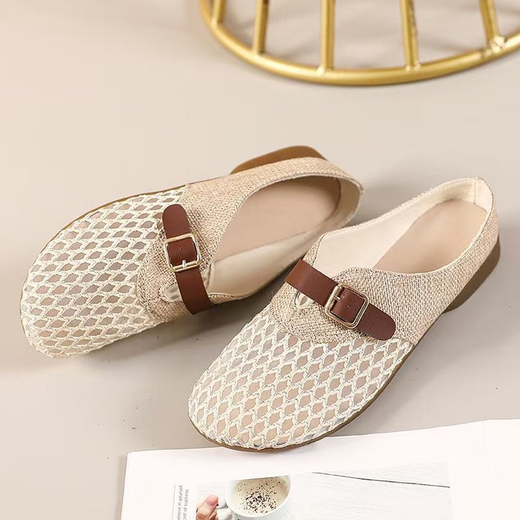 여성을위한 메쉬 하프 슬리퍼 2025 새로운 여름 플랫 바닥 중공 패션 중공 여름 스타일 Baotou 외부 샌들스토어 가기