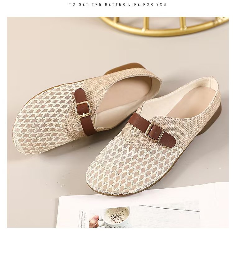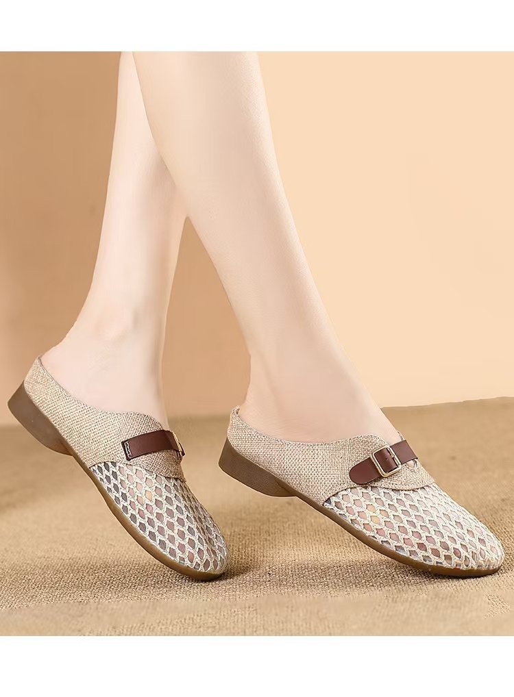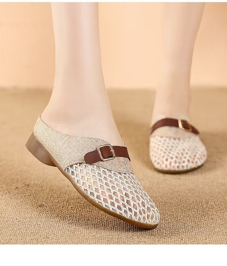 여성을위한 메쉬 하프 슬리퍼 2025 새로운 여름 플랫 바닥 중공 패션 중공 여름 스타일 Baotou 외부 샌들