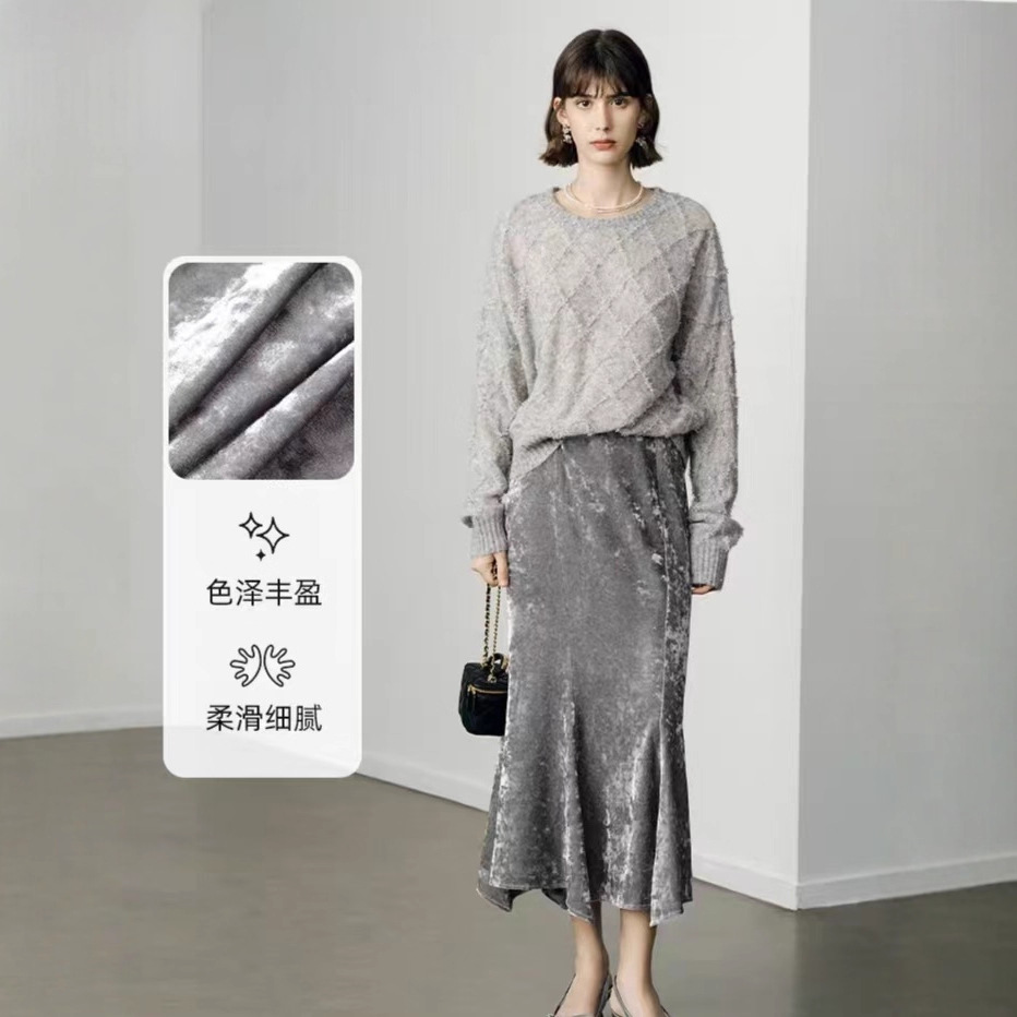 重磅100%真丝桑蚕丝丝绒半身裙女 秋冬法式复古鱼尾裙侧开叉长裙