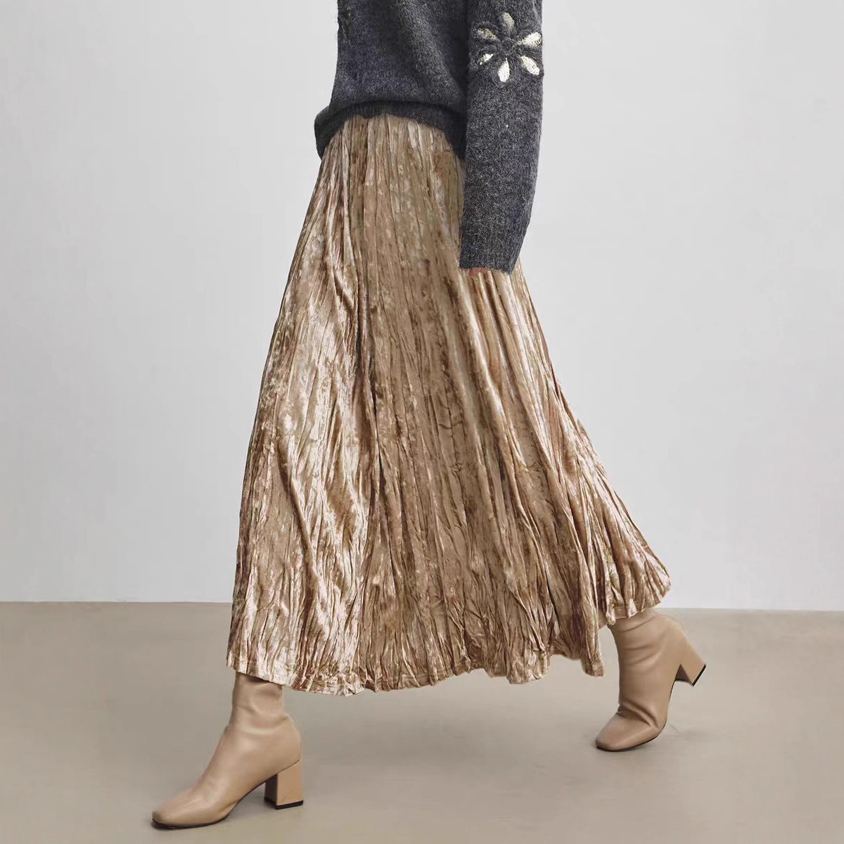 香槟色丝绒高级感气质半身裙女秋冬加厚长款高腰a字丝绒百褶裙子