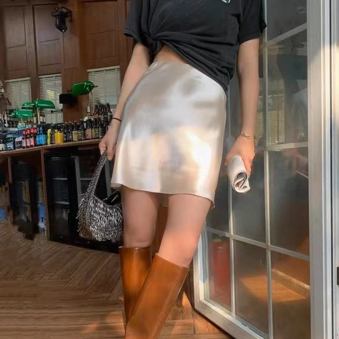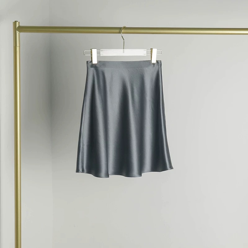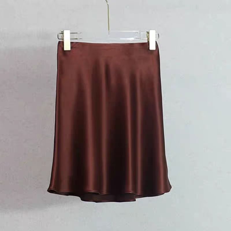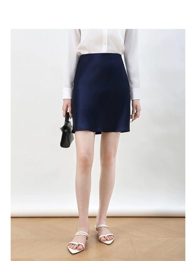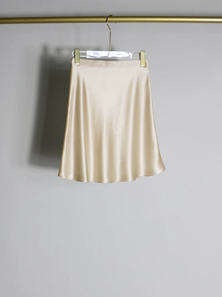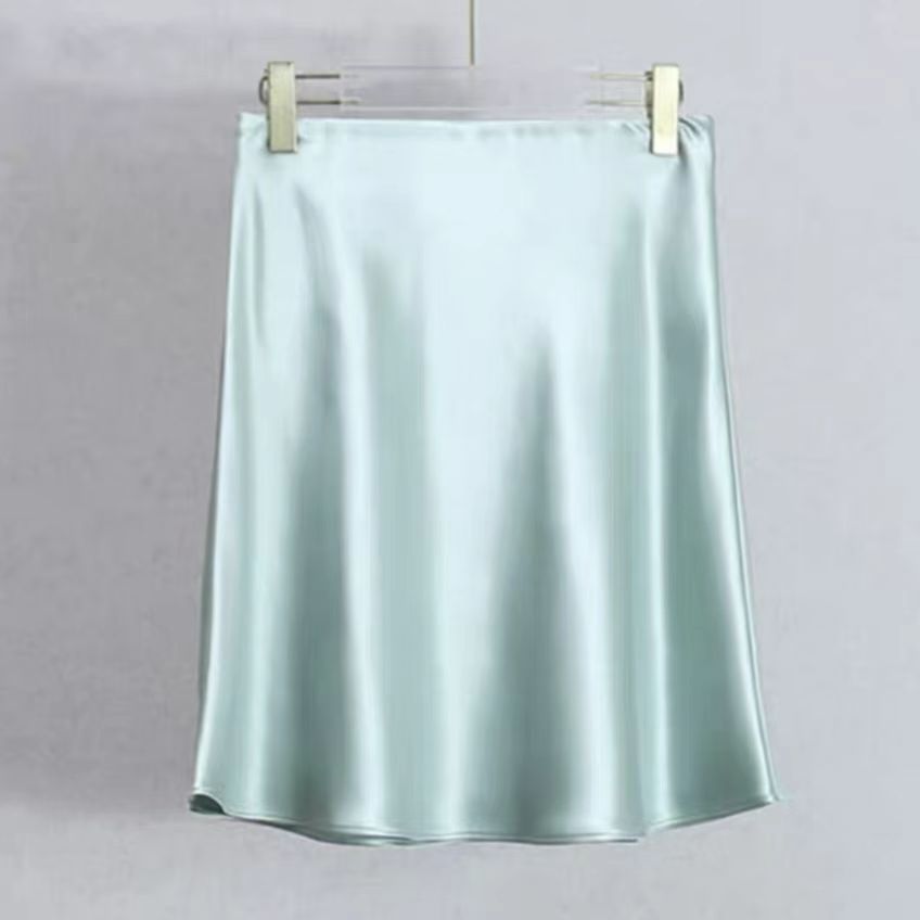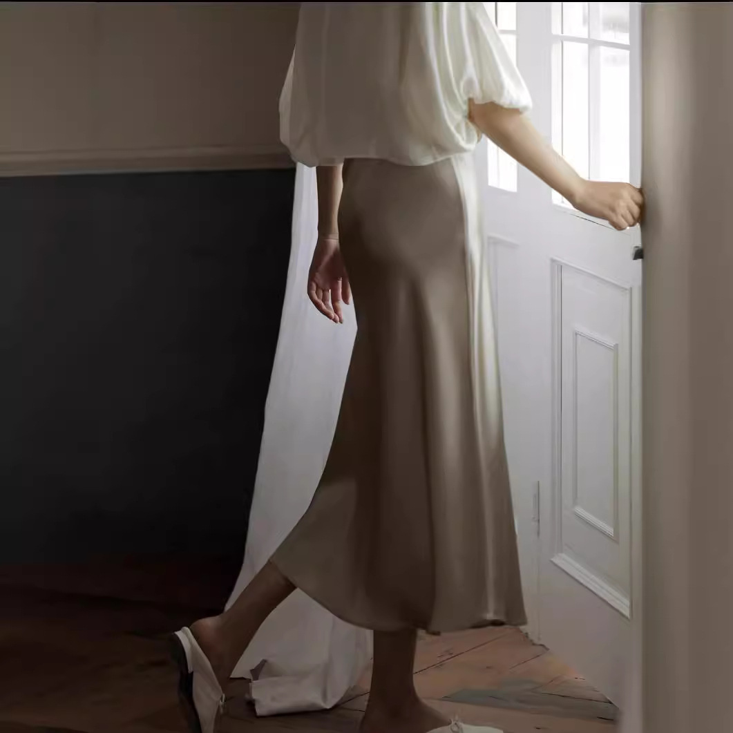 45°斜裁三醋酸真丝缎面 松紧腰高腰 过膝A字裙包臀半身裙中长款