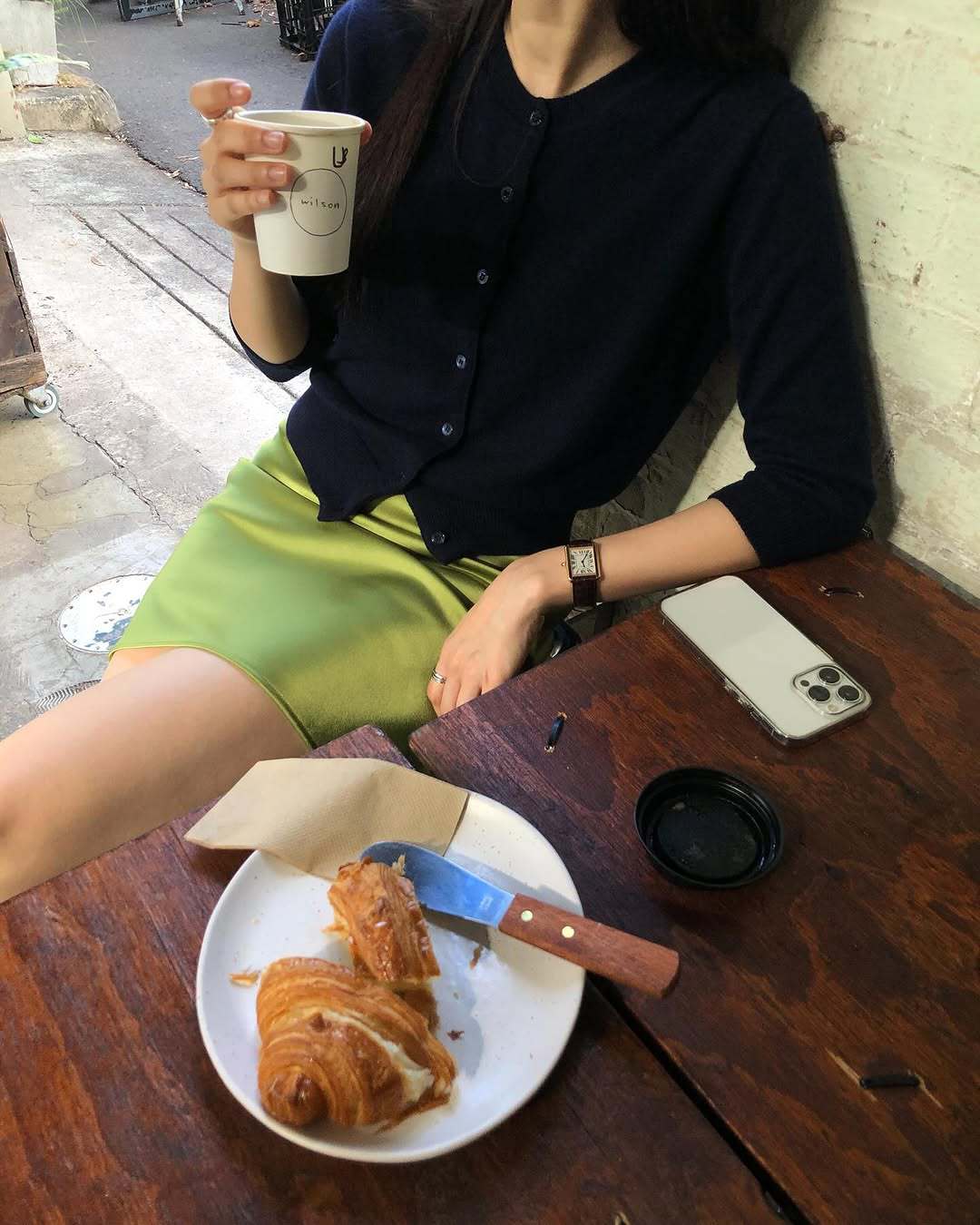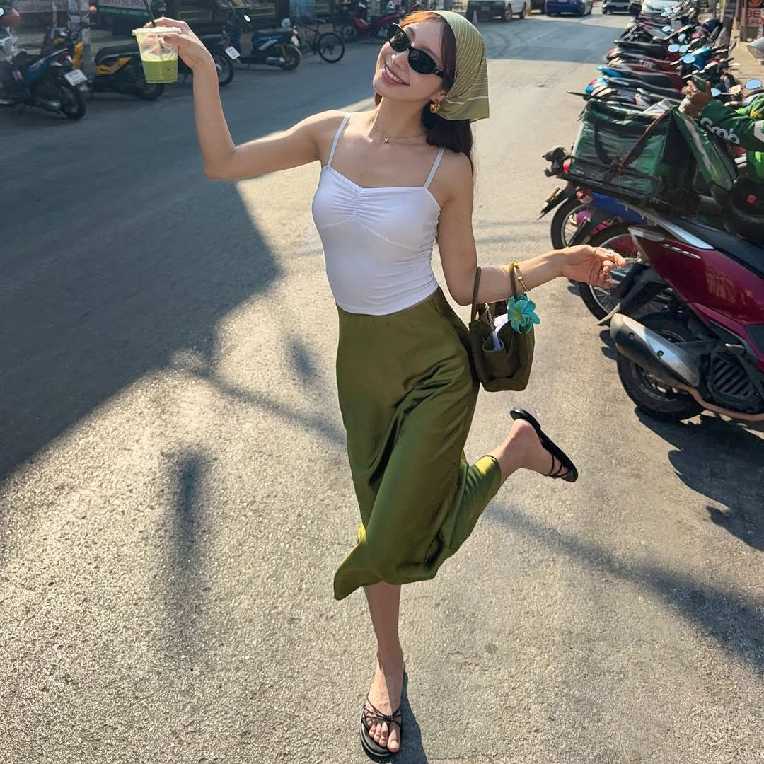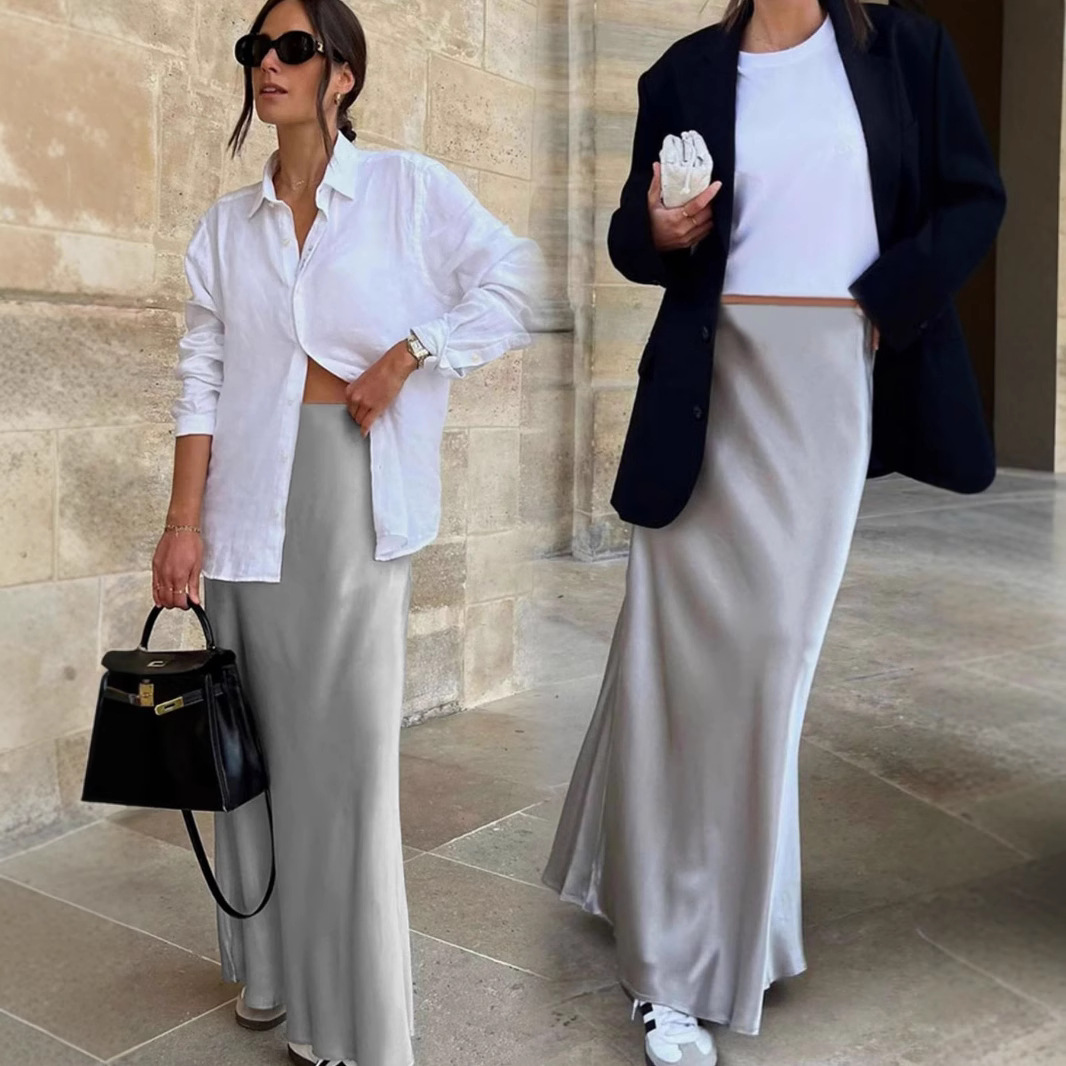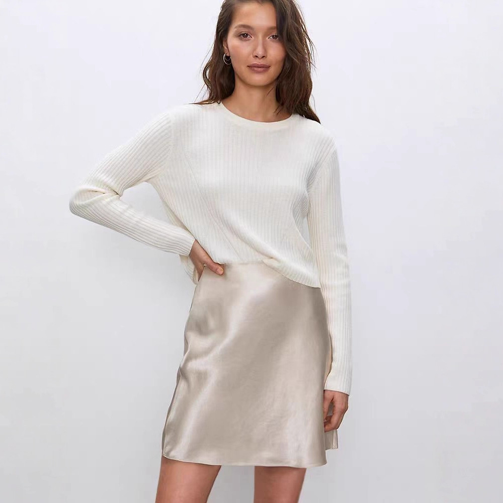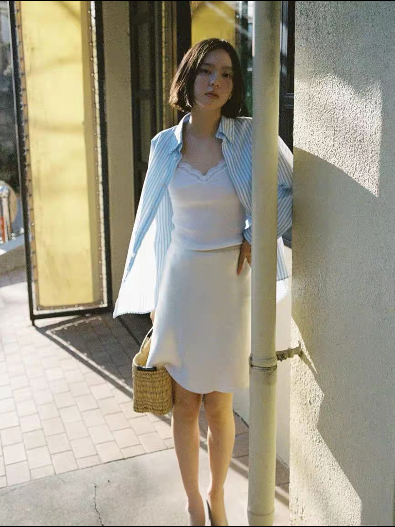 45°斜裁三醋酸真丝缎面 松紧腰高腰 过膝A字裙包臀半身裙中长款