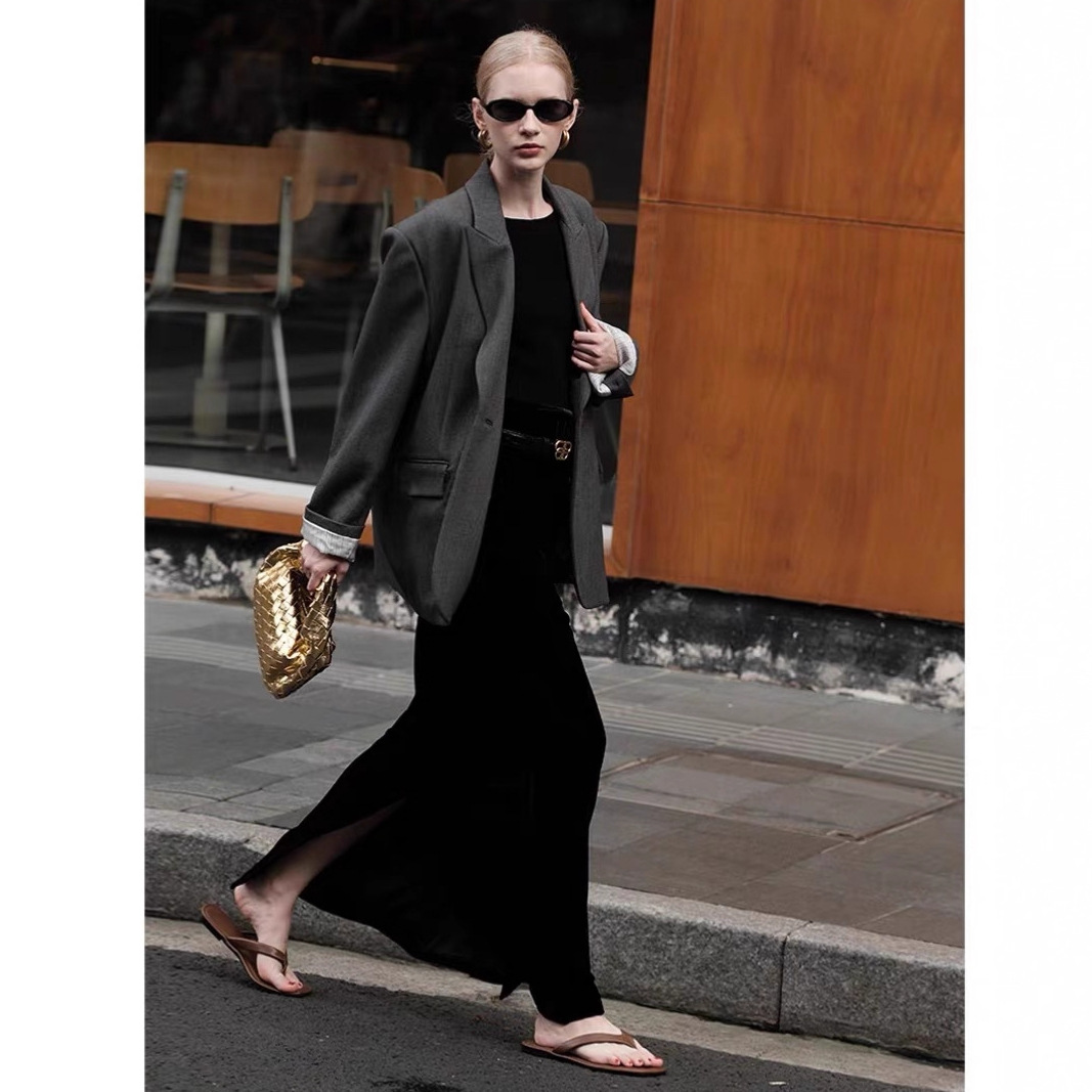 超长款立体丝绒半身裙子 光泽后开叉A字半裙女直筒 秋冬版型超棒