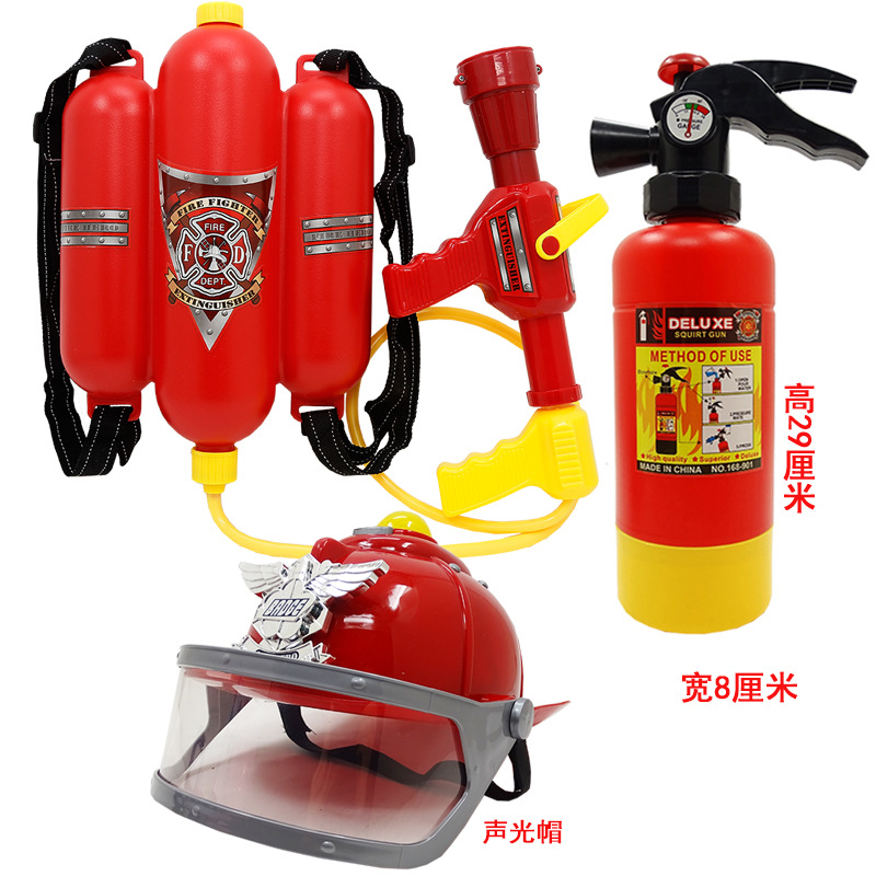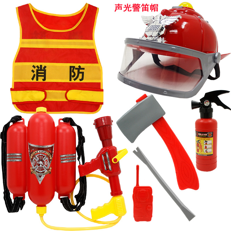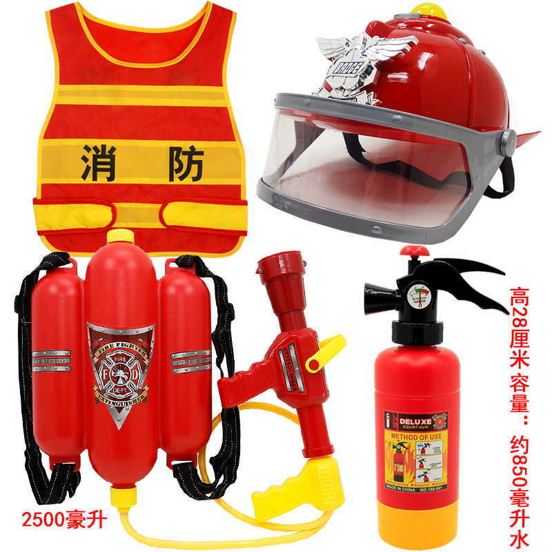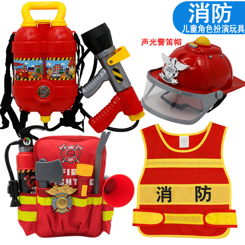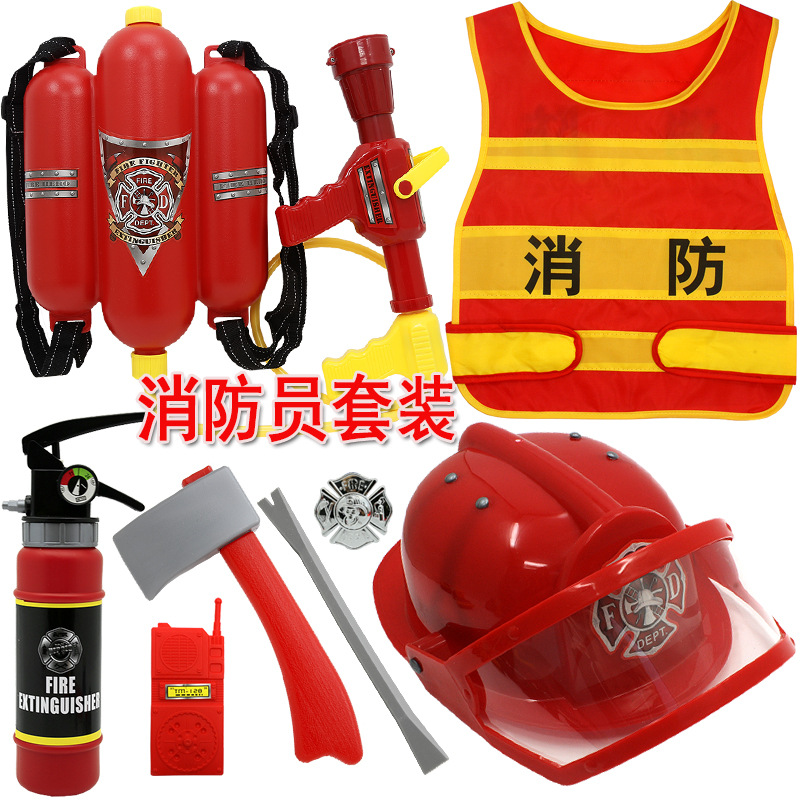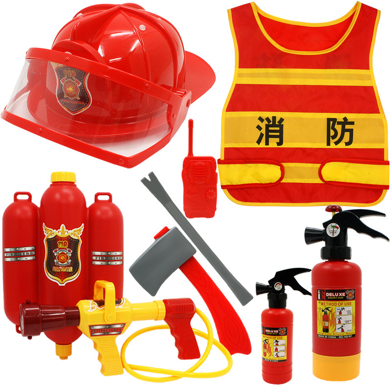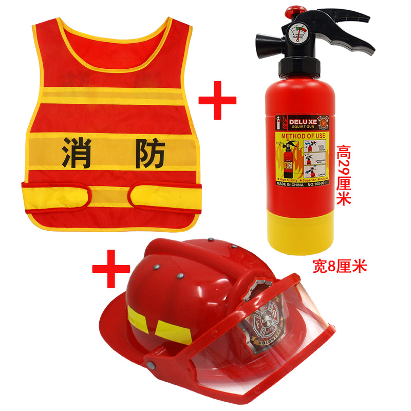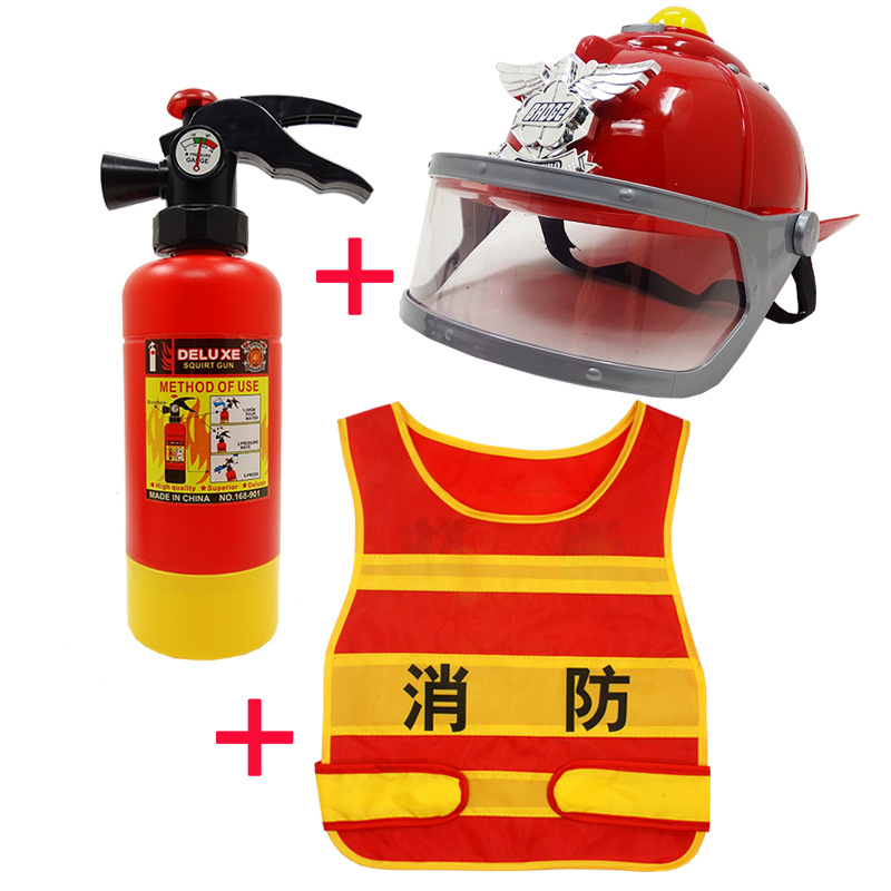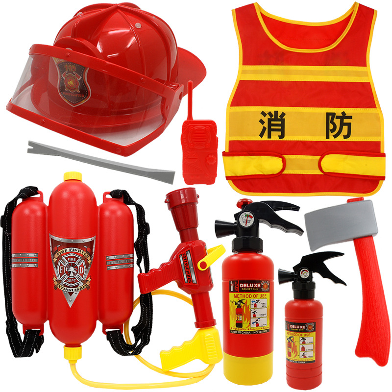 어린이 소방관 장난감 샘 세트 장비 유치원 역할 놀이 의상 소화기 조끼 모자 물총