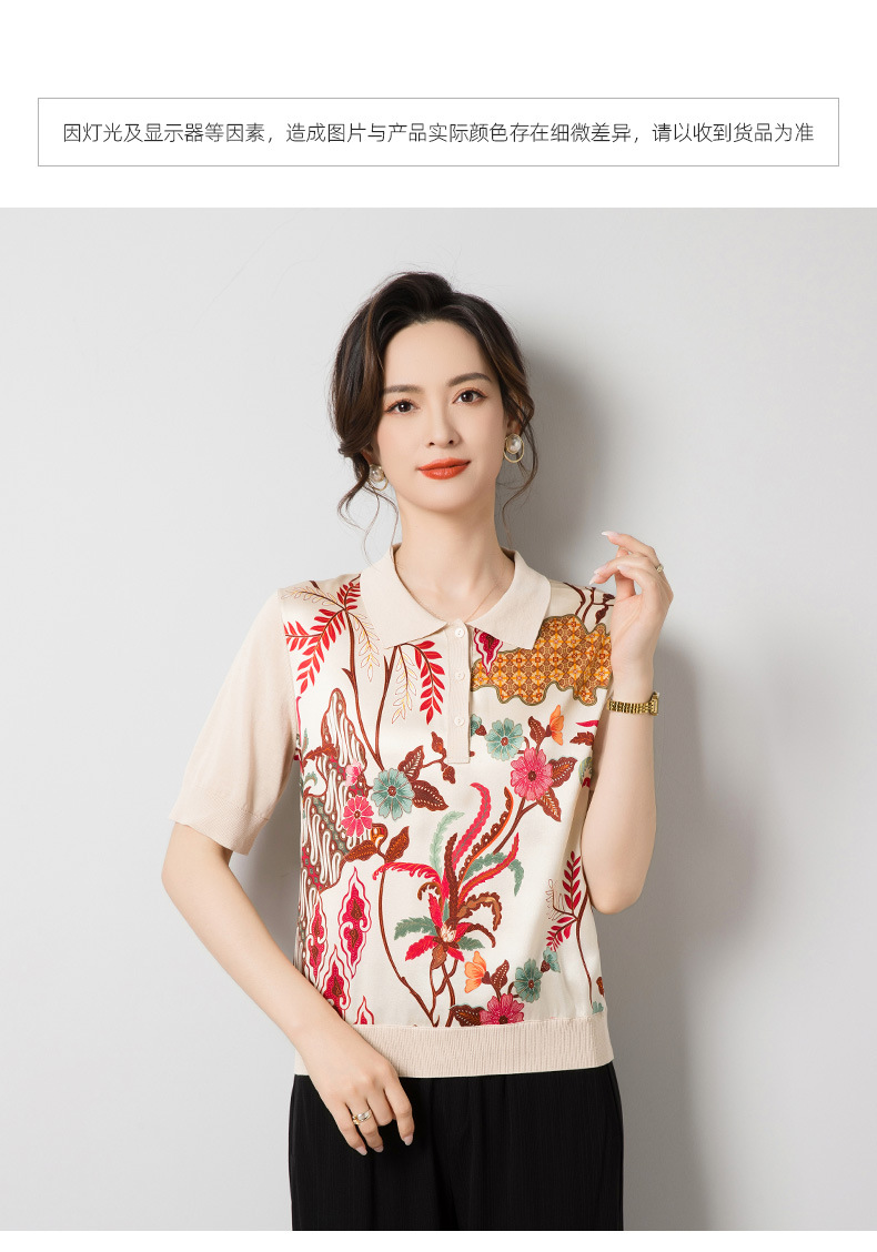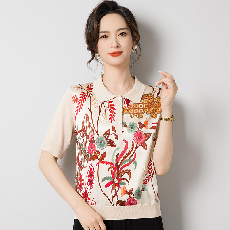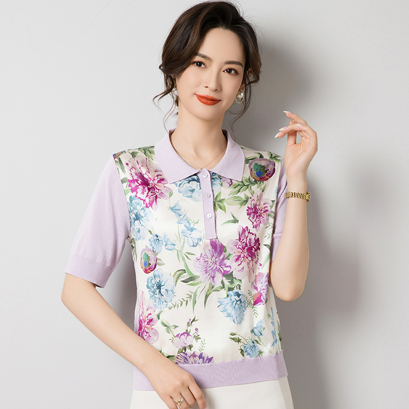 드롭 배송 중간 소매 멀 베리 실크 니트 탑 스플 라이스 실크 프린트 폴로 셔츠 여성 풀오버 티셔츠 J62538A