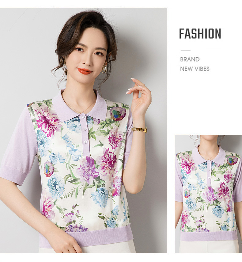 드롭 배송 중간 소매 멀 베리 실크 니트 탑 스플 라이스 실크 프린트 폴로 셔츠 여성 풀오버 티셔츠 J62538A스토어 가기
