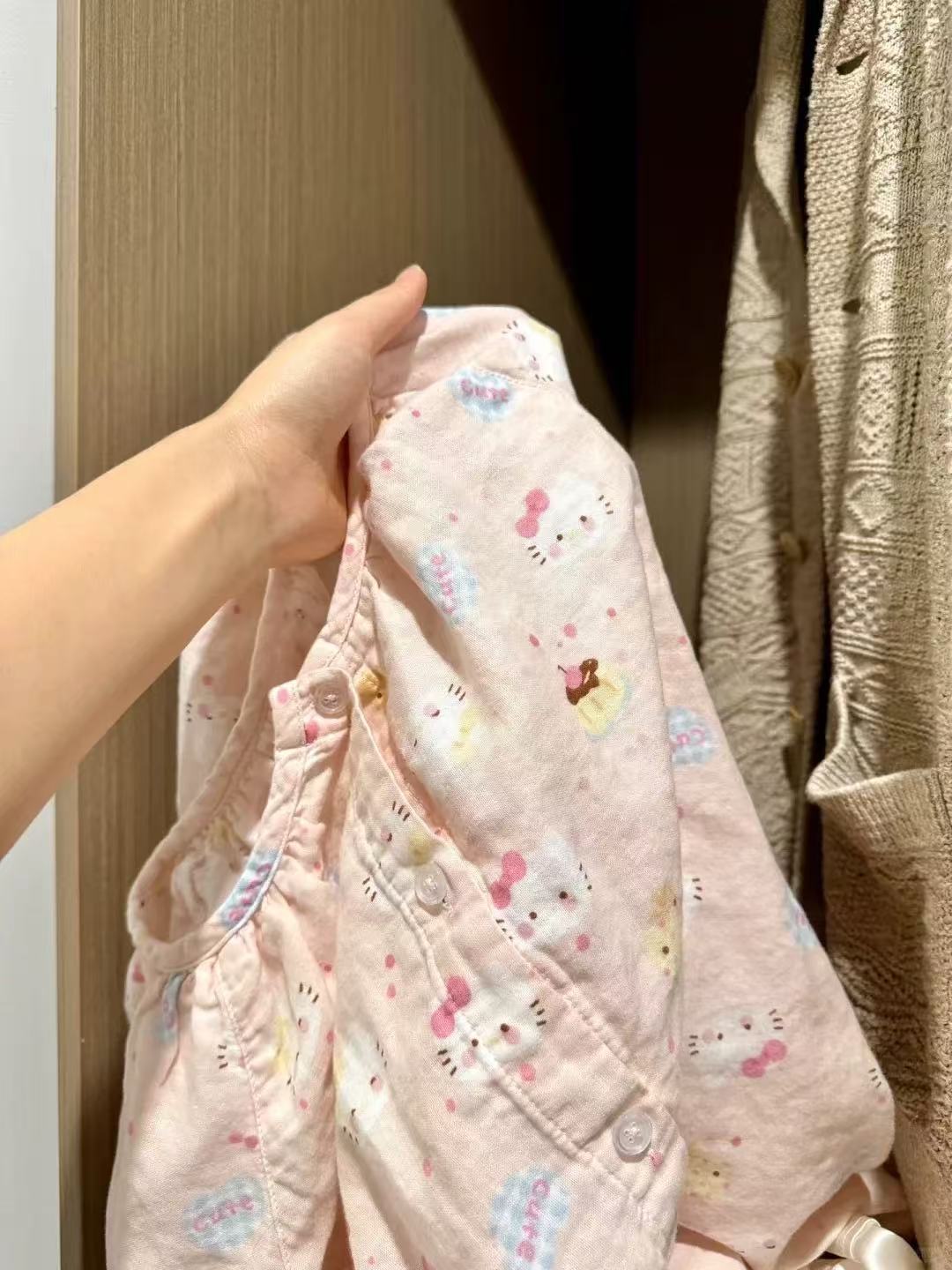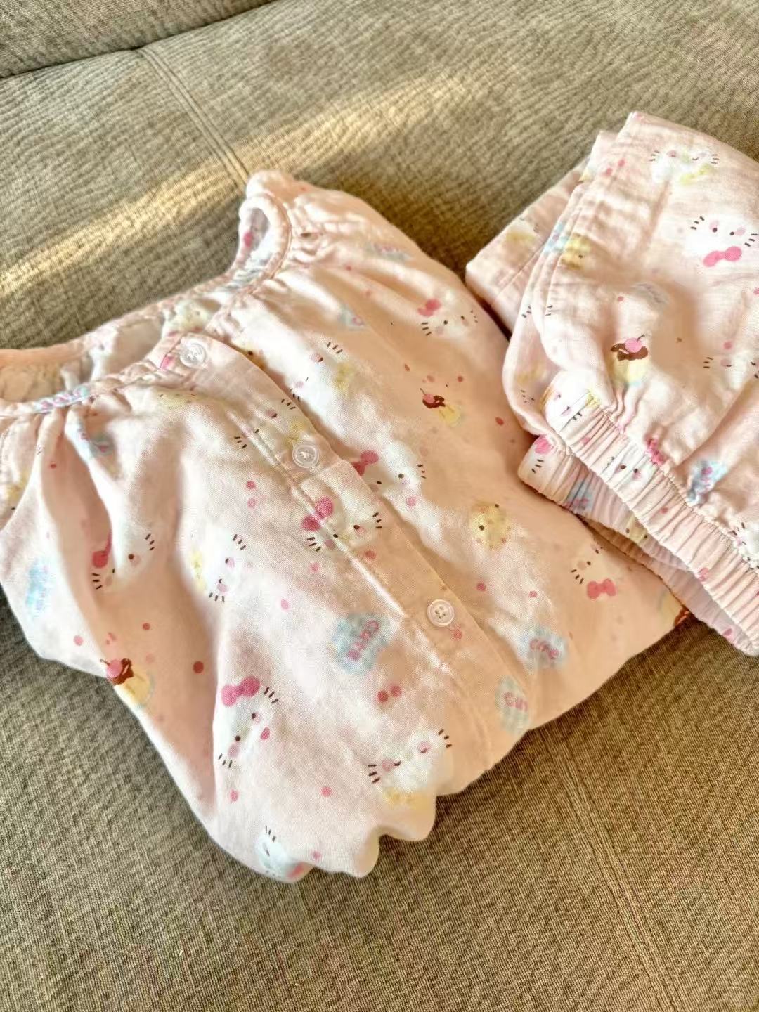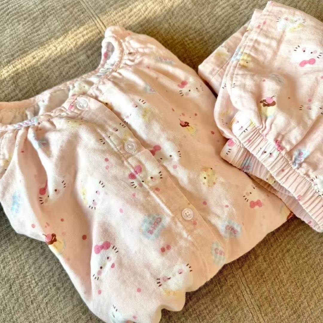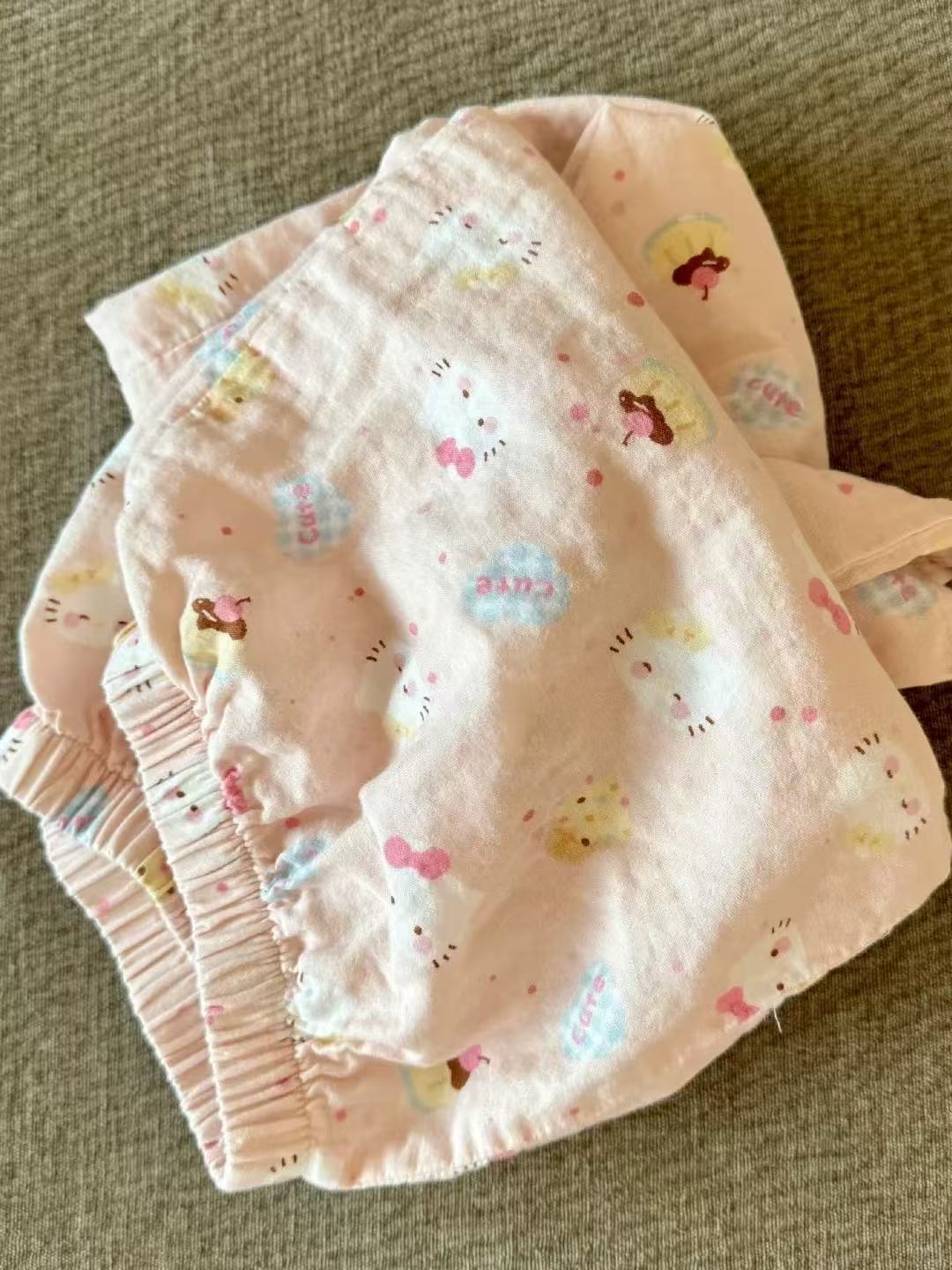 • 핑크 고양이 라운드 넥 더블 레이어 거즈 긴팔 바지
