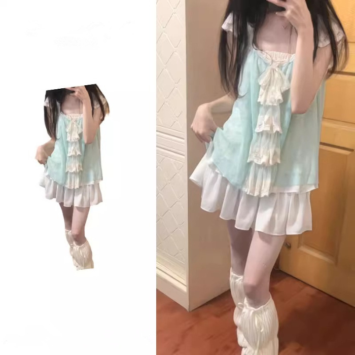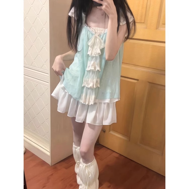 여름 민트 캔디 얇은 봄 나들이 쉬폰 여성 달콤한 작은 플라잉 슬리브 티셔츠 짧은 치마 정장 빈티지 나나 스타일 핫 소녀스토어 가기