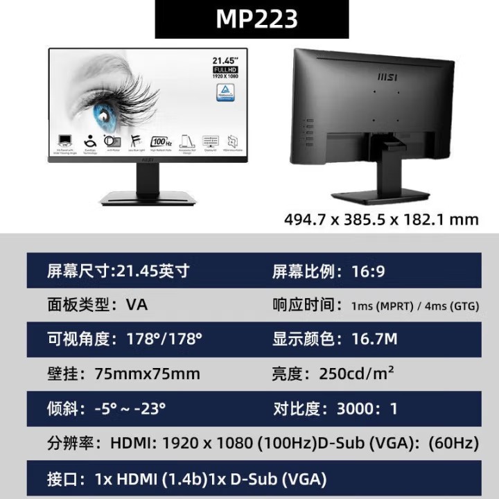PRO MP223 21.5인치 100hz 안티 블루 라이트 벽걸이형 홈 오피스 컴퓨터 LCD 모니터 화면 VGA