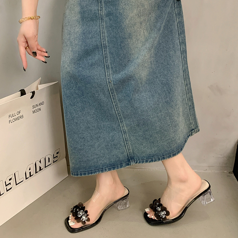 2025년 여름 신상 여성용 크리스탈 두꺼운 굽 슬립온 하이힐 슬리퍼, 편안하고 다재다능하며 패셔너블한 아우터 슬리퍼스토어 가기