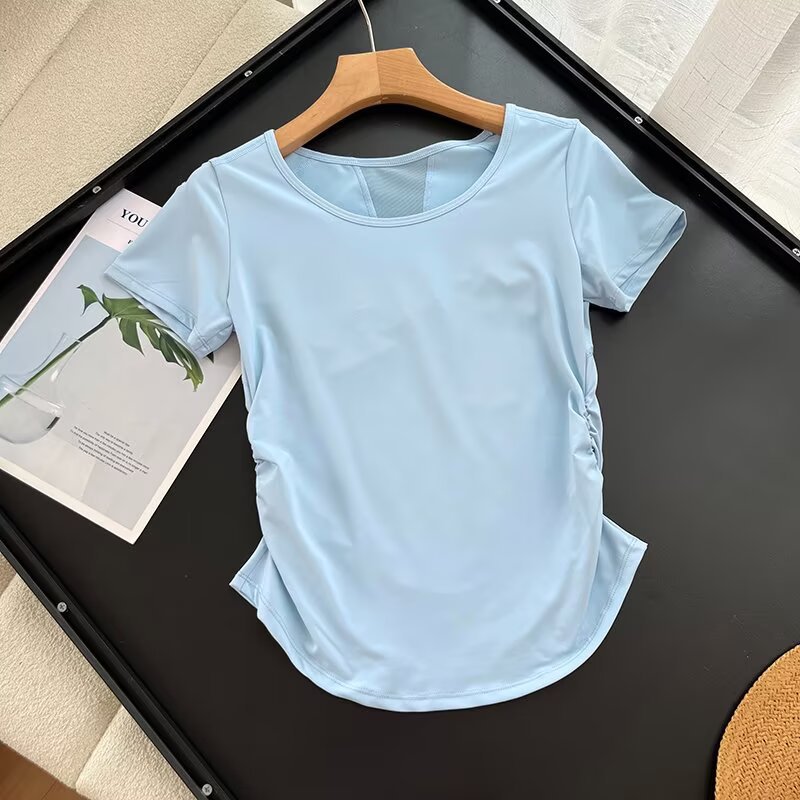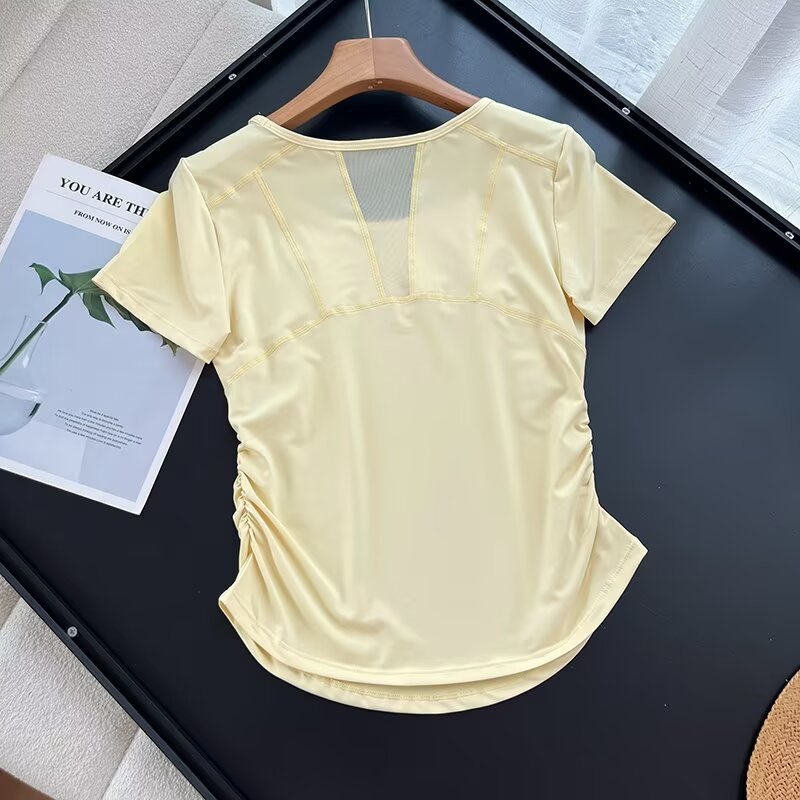 눈을 감고 들어가세요! LU의 같은 스타일 주름 속건성 땀 흡수 요가복 메쉬 스플라이싱 통기성 여성용 반팔 티셔츠 탑
