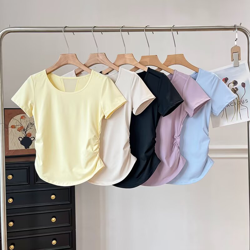 눈을 감고 들어가세요! LU의 같은 스타일 주름 속건성 땀 흡수 요가복 메쉬 스플라이싱 통기성 여성용 반팔 티셔츠 탑스토어 가기
