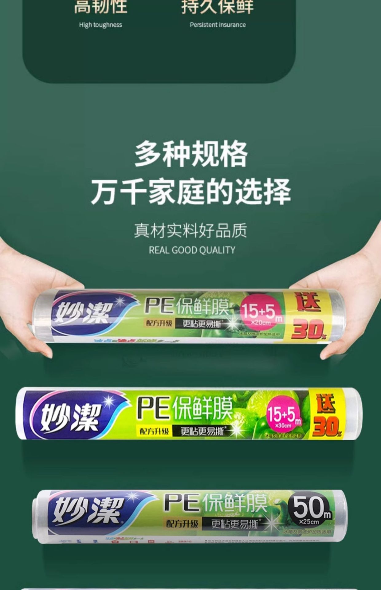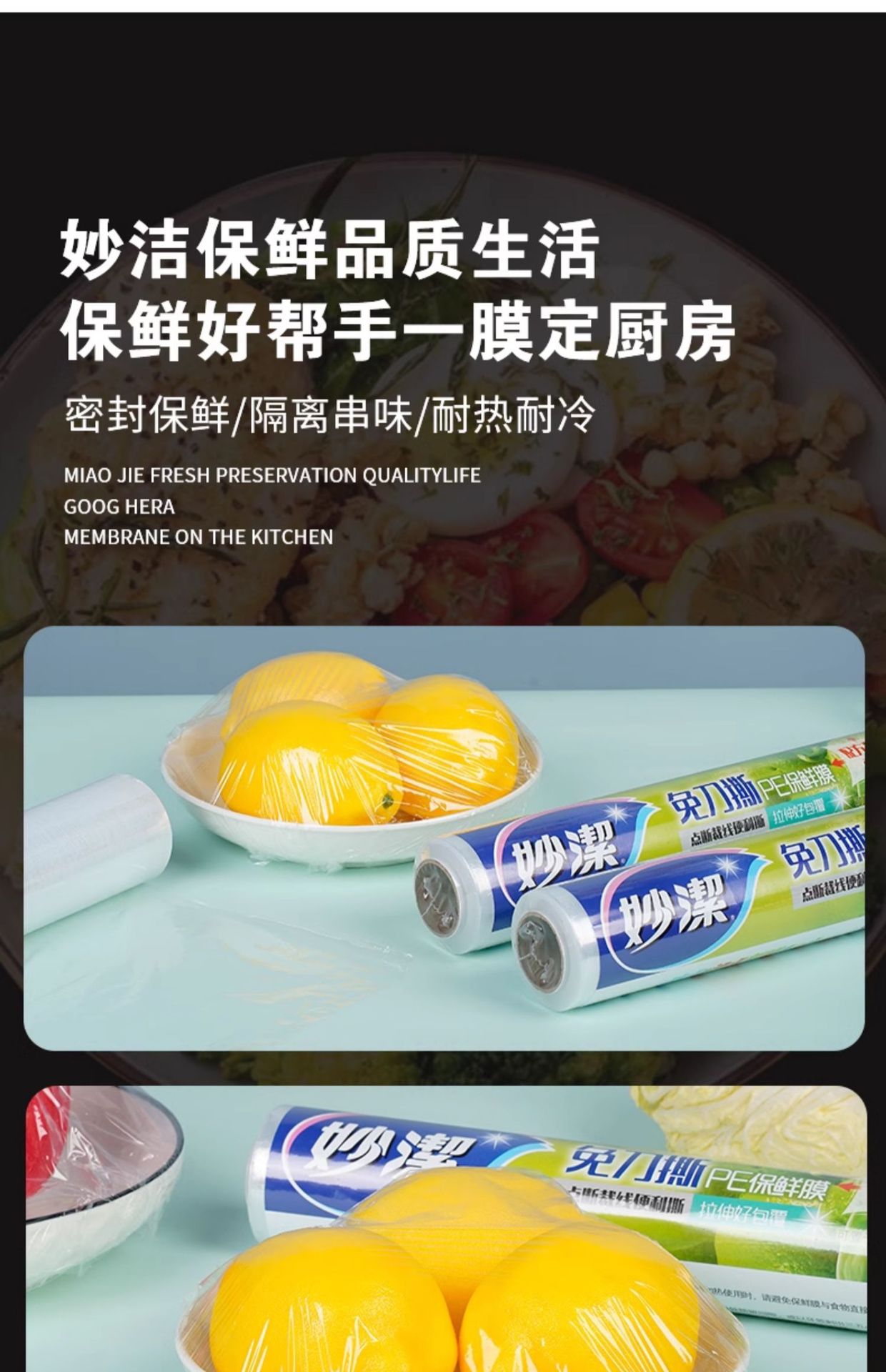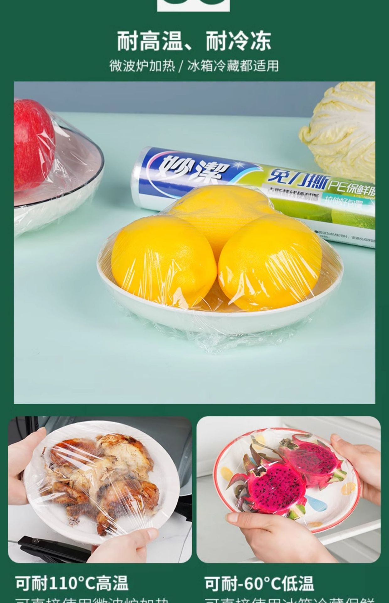 Miaojie 접착 필름 식품 등급 PE 가정용 경제적 대형 롤 점파 플라스틱 필름 냉장고 전자 레인지 냉장