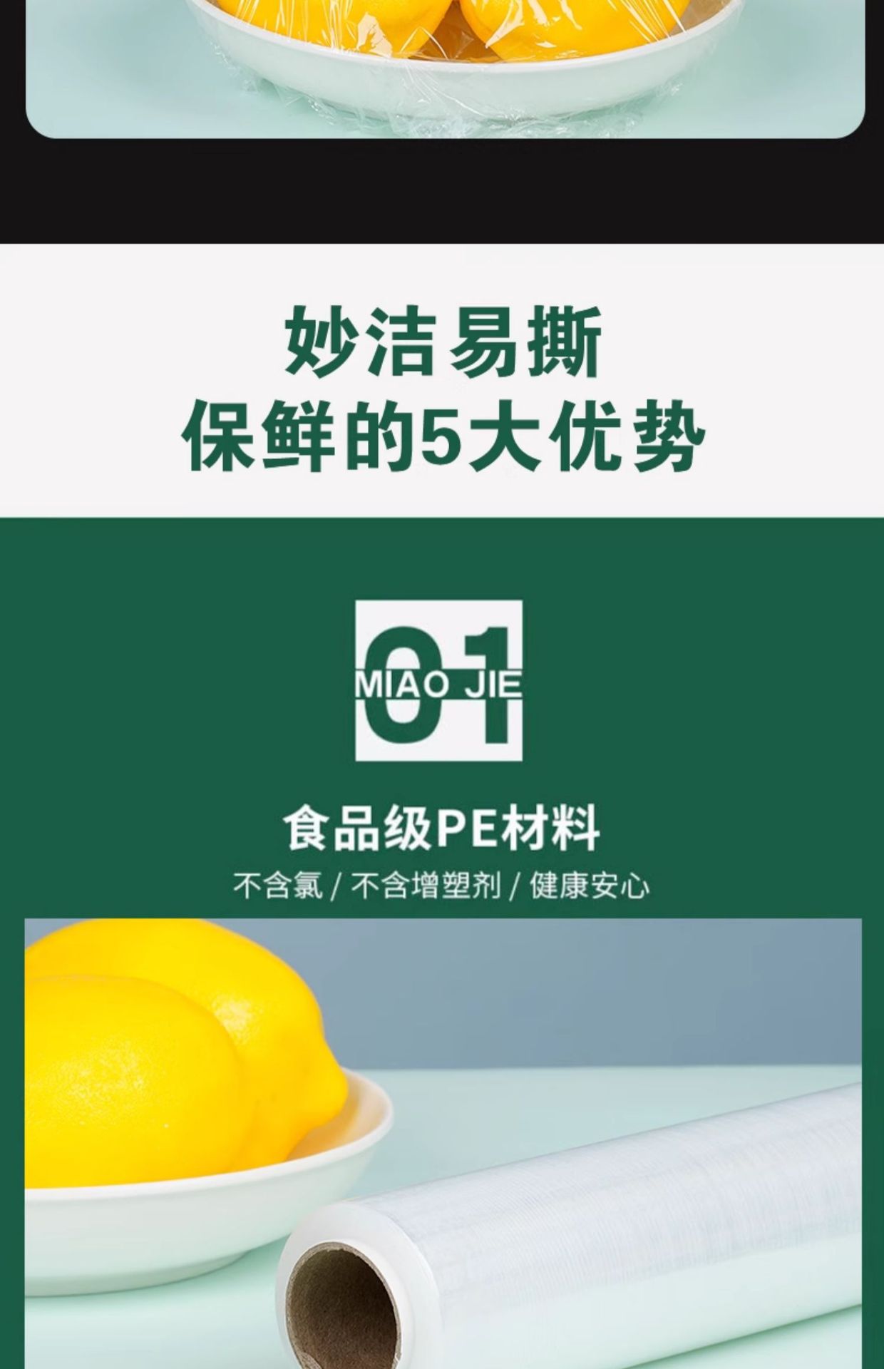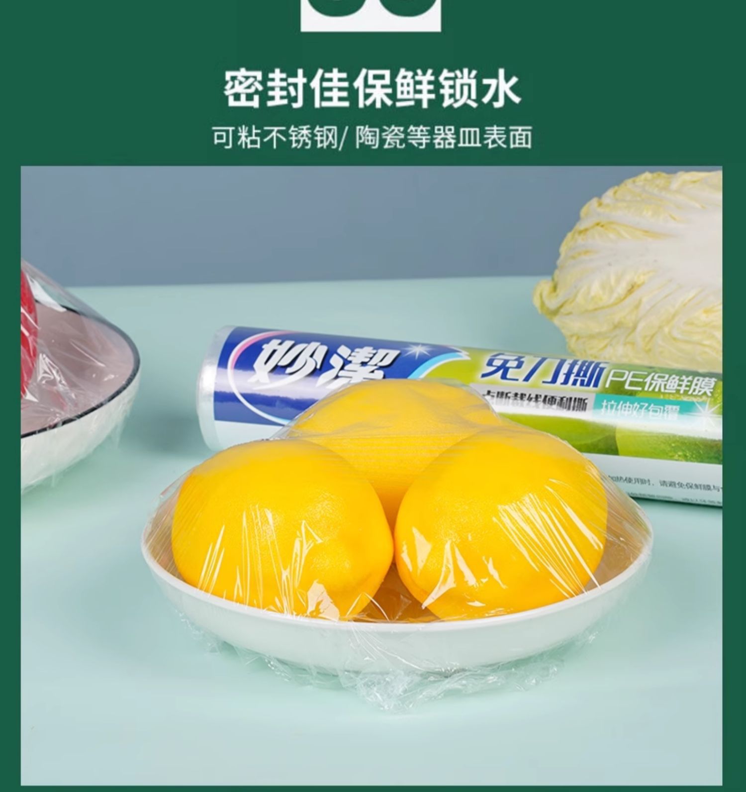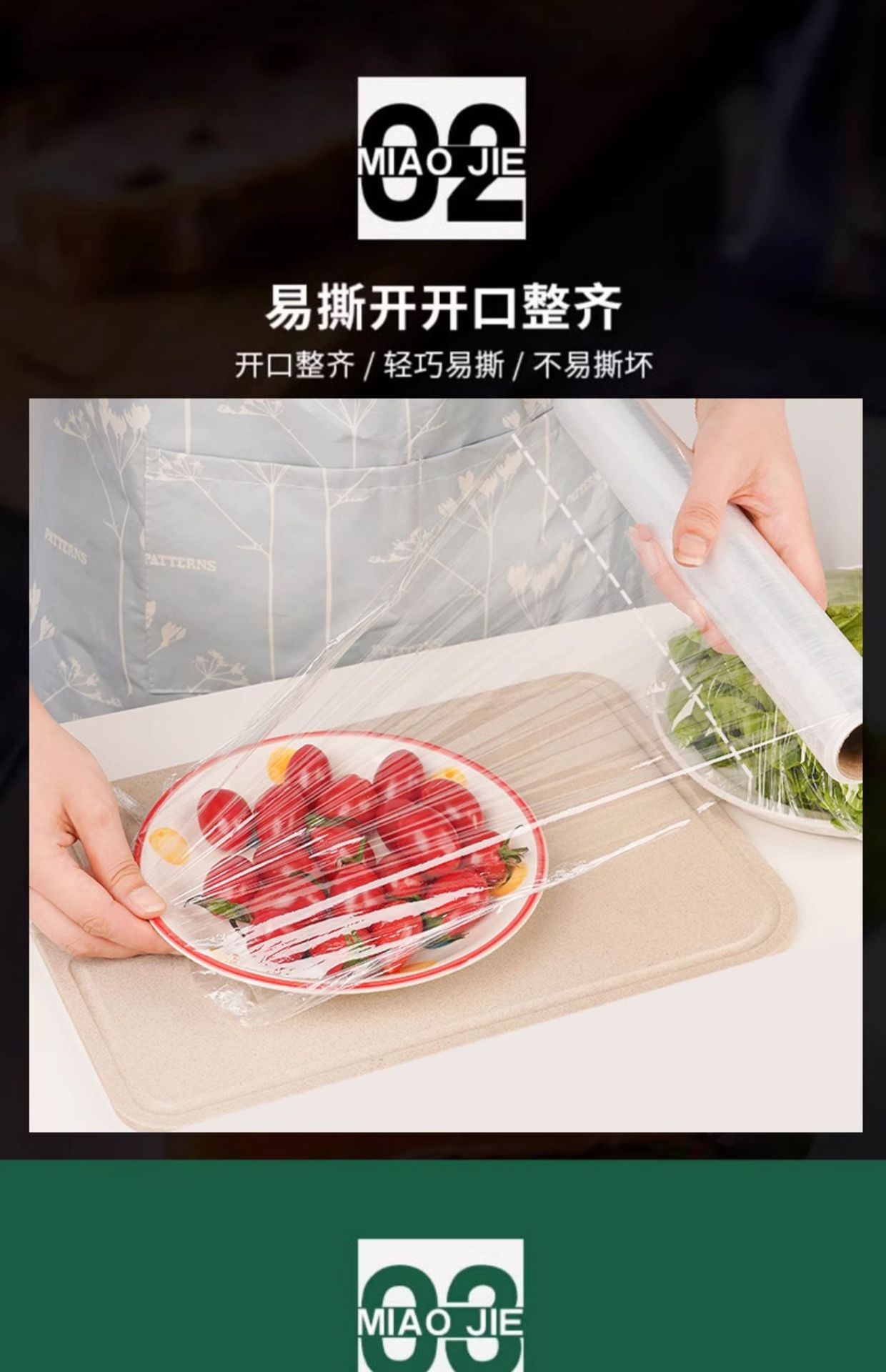 Miaojie 접착 필름 식품 등급 PE 가정용 경제적 대형 롤 점파 플라스틱 필름 냉장고 전자 레인지 냉장
