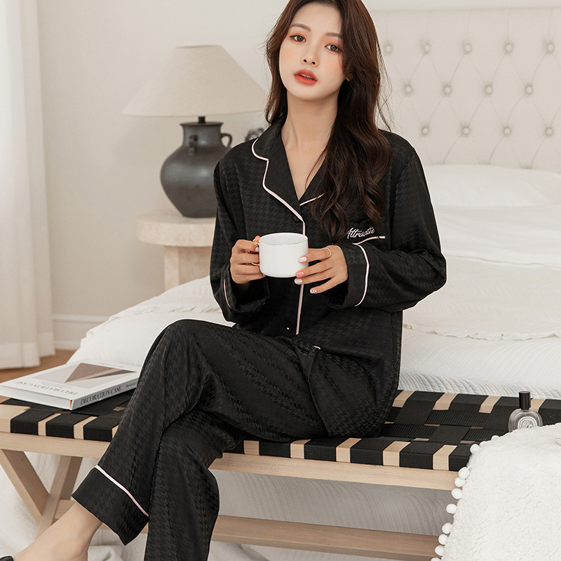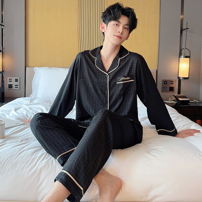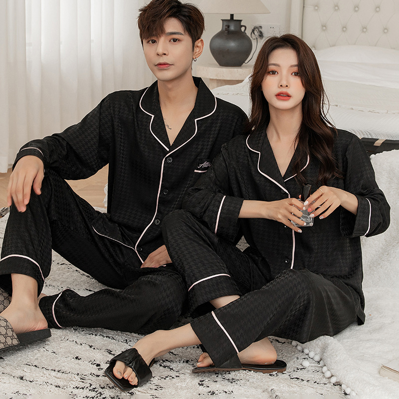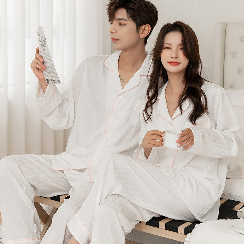 클리어런스 커플 아이스 실크 잠옷 여성용 긴팔 바지 가디건 솔리드 컬러 물떼새 격자 자카드 하이 엔드 남성용 홈웨어스토어 가기