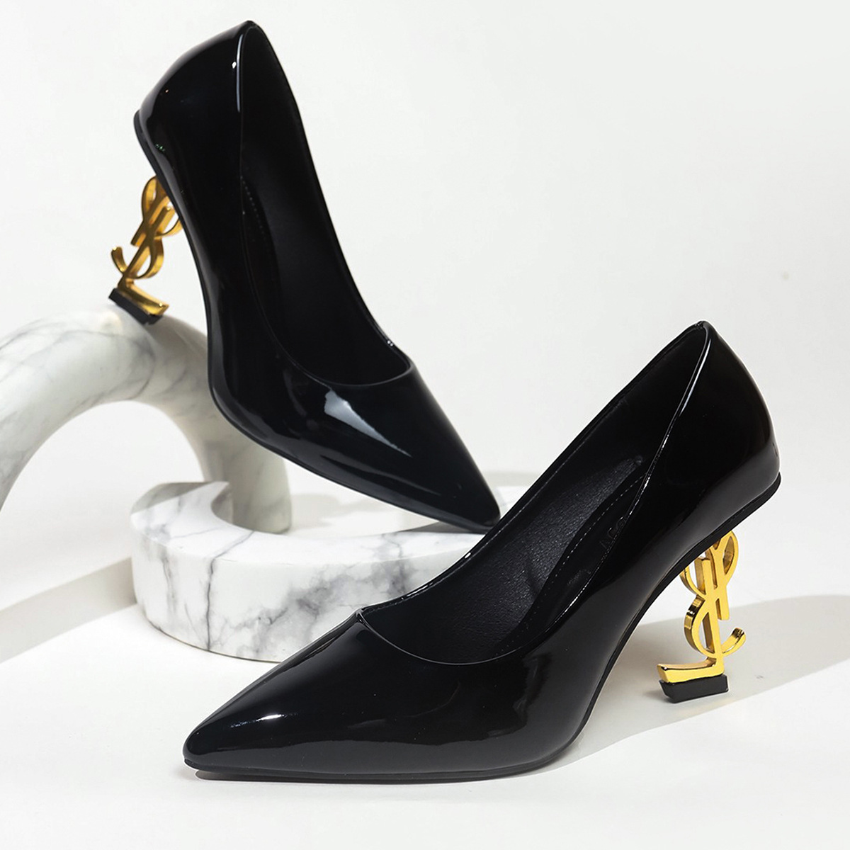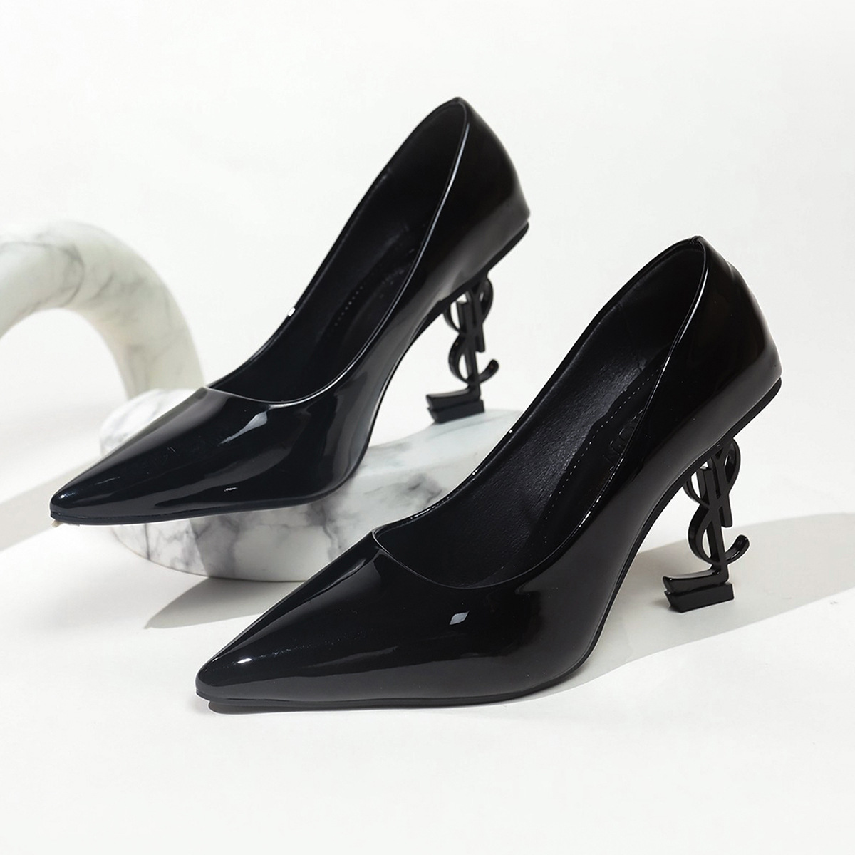 국경 간 대외 무역 여성 하이힐 골드 레터 힐 특허 가죽 뾰족한 신발 2025 새로운 스타일 섹시한 연예인