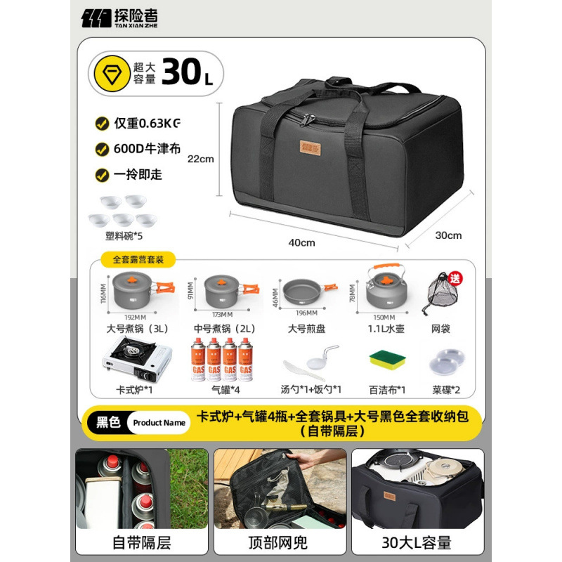 • 카세트 스토브 + 가스 탱크 + 냄비 및 프라이팬 전체 세트 + 대형 검정색 전체 수납 가방(별도 수납 공간 포함)