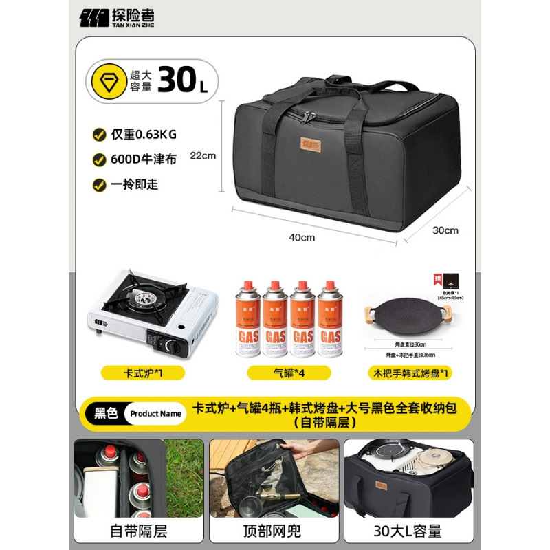 • 카세트 스토브 + 가스통 + 한국식 베이킹 팬 + 대형 검정색 전체 수납 가방(수납 공간 포함)