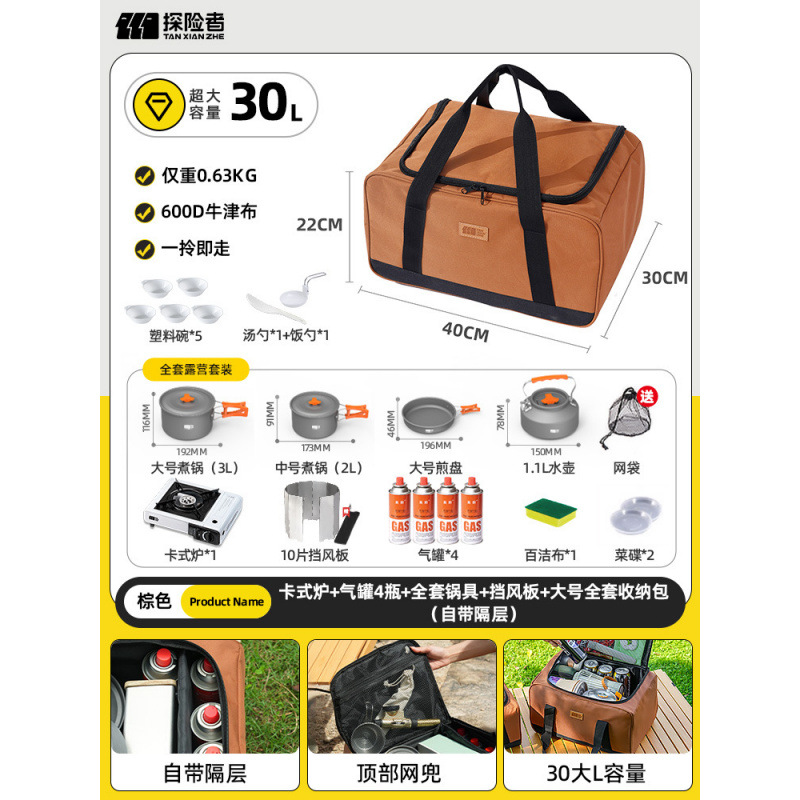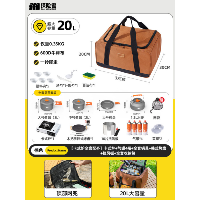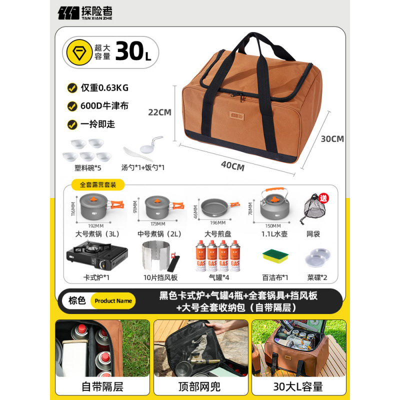 • 카세트 스토브 + 가스 탱크 + 냄비 및 팬 풀 세트 + 앞 유리 + 대형 풀 세트 보관 가방(별도의 수납 공간 포함)