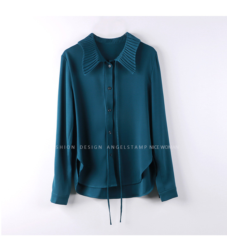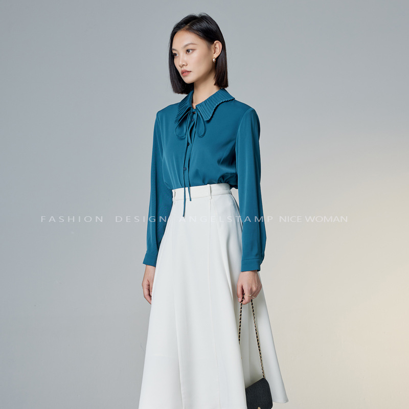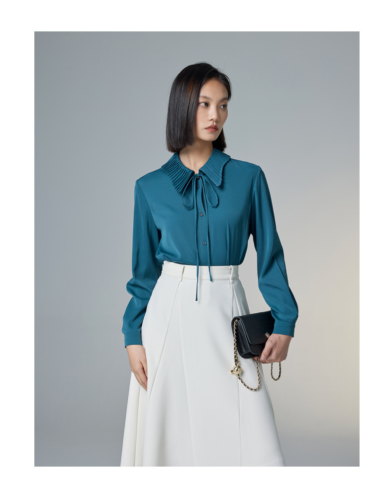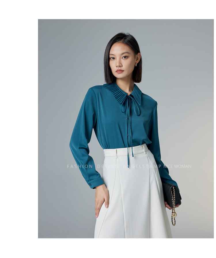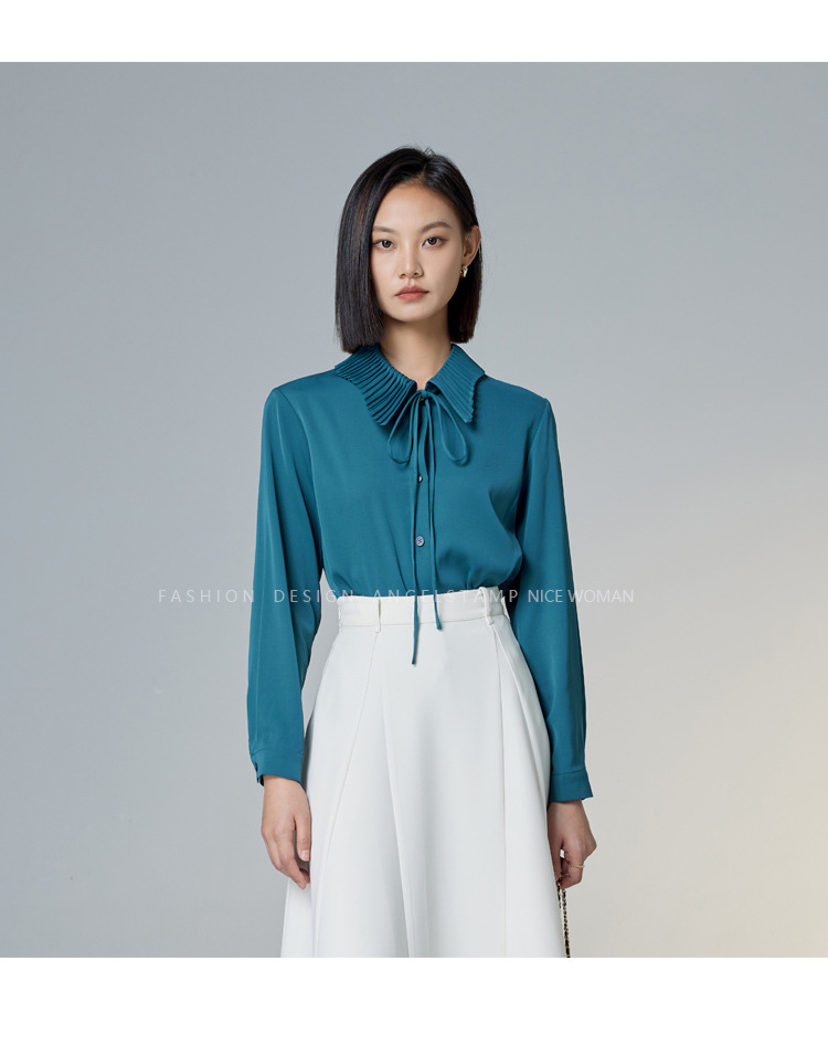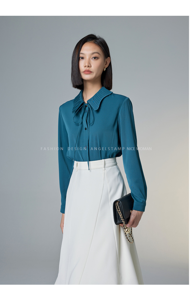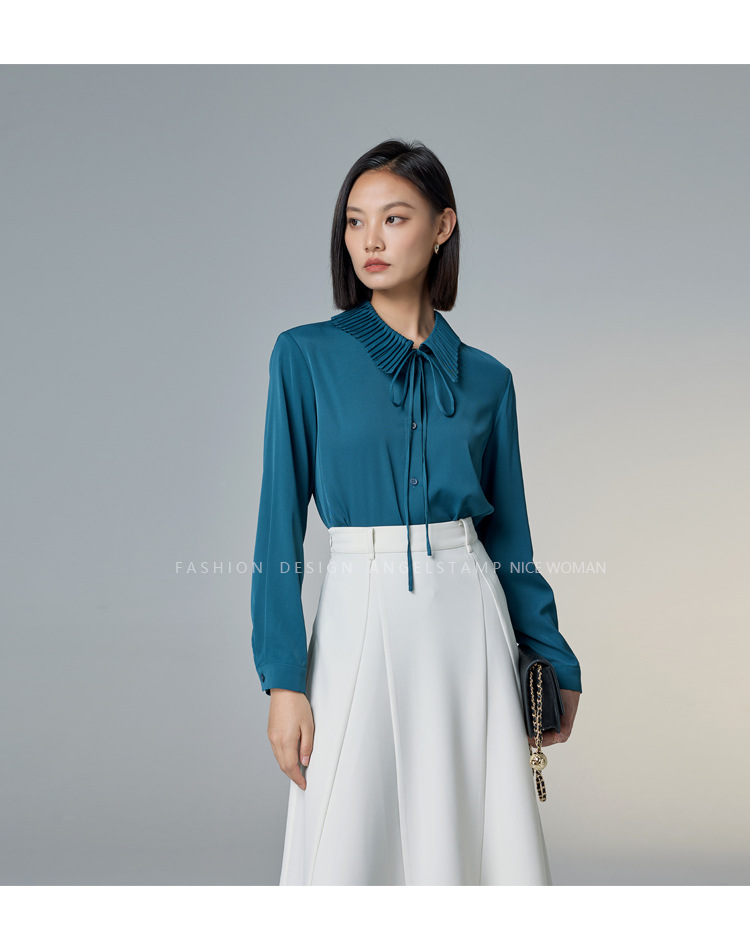 2025 새로운 틈새 디자인 불규칙한 오르간 칼라 레이스 업 공작 블루 긴팔 여성용 전문 셔츠