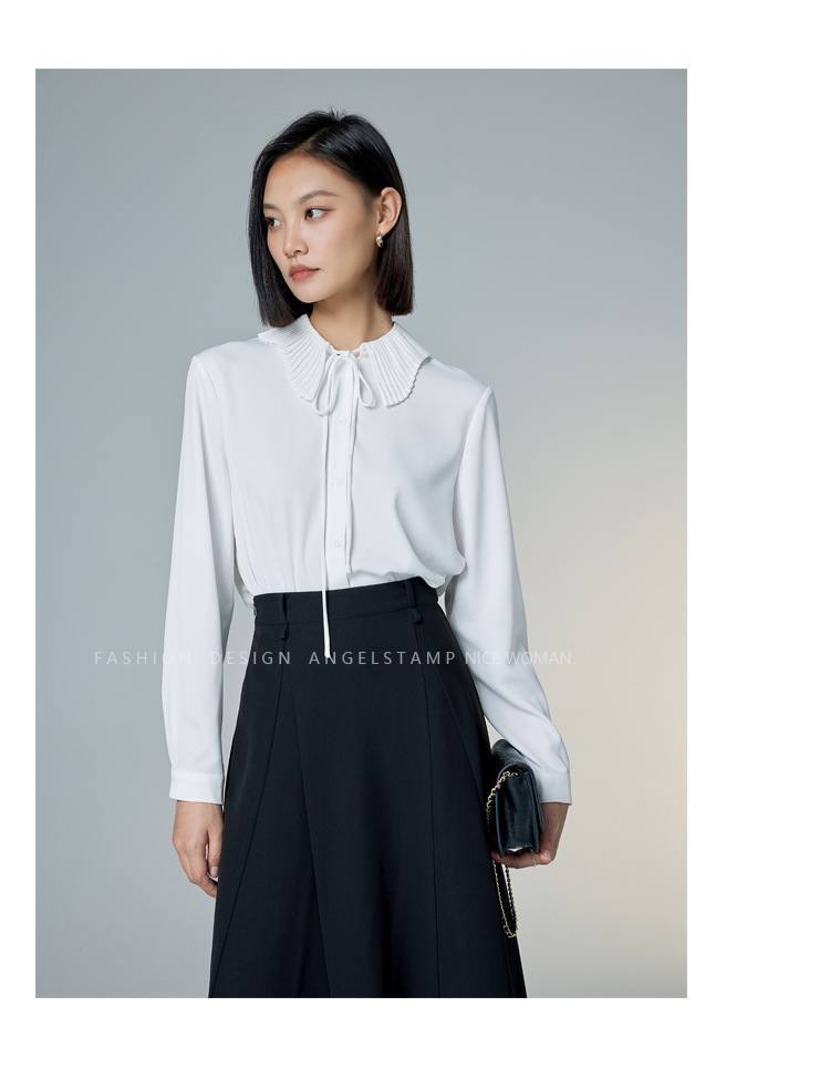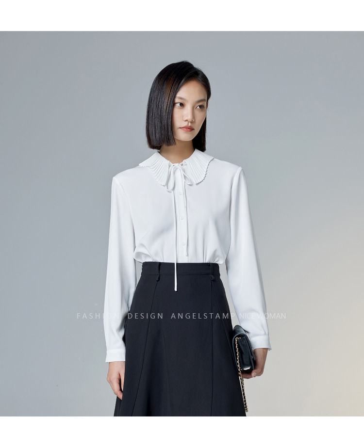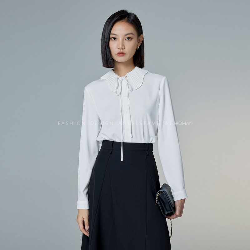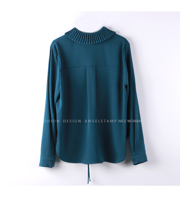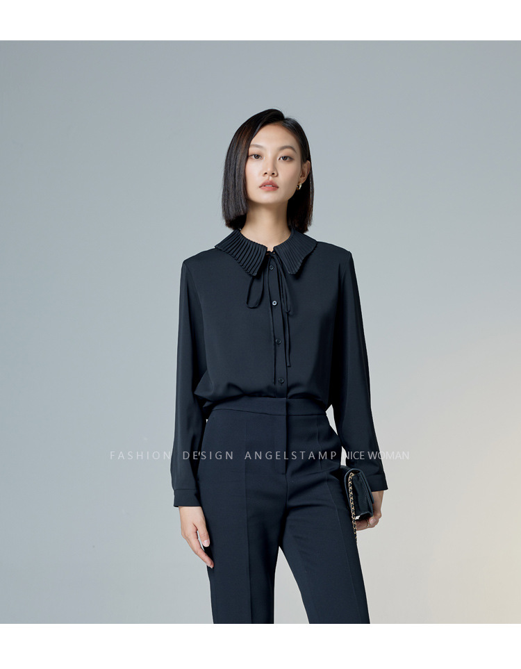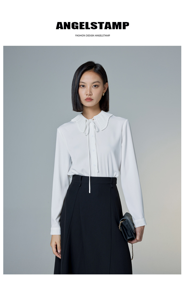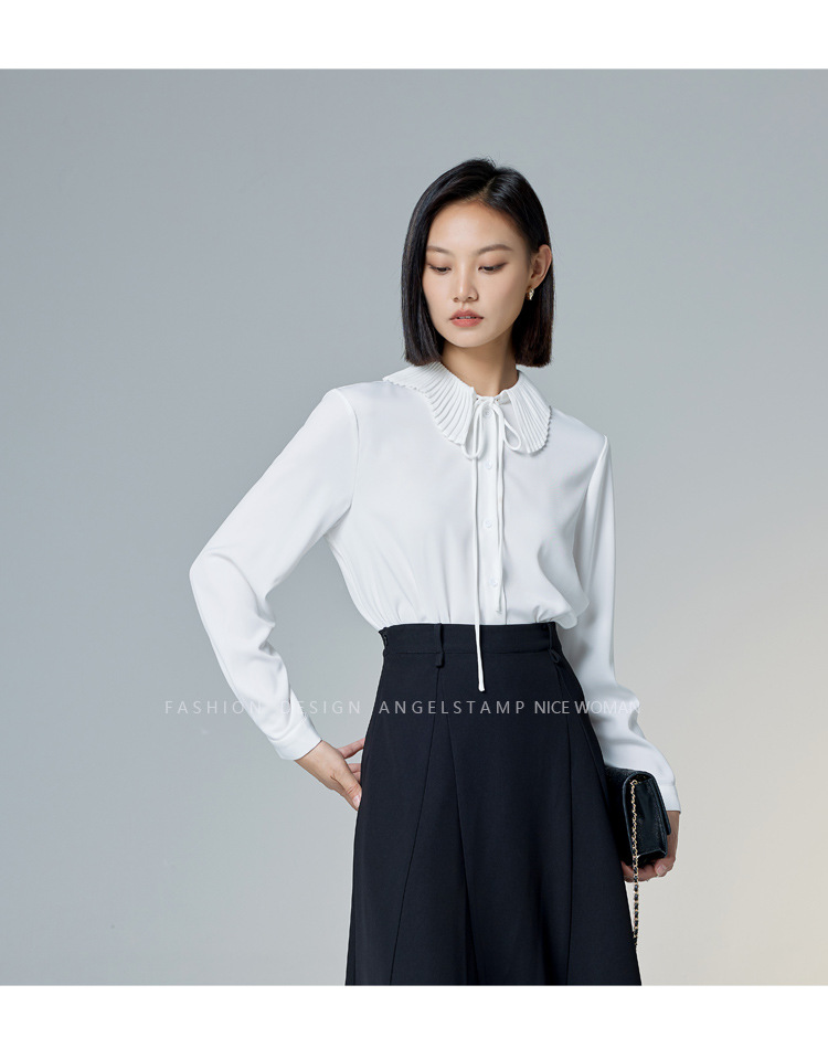 2025 새로운 틈새 디자인 불규칙한 오르간 칼라 레이스 업 공작 블루 긴팔 여성용 전문 셔츠